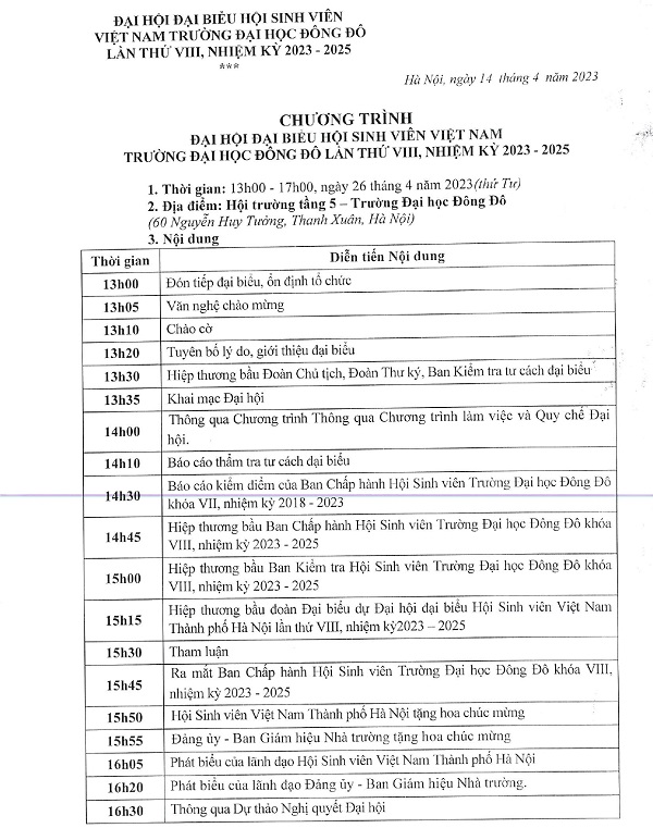 Chương trình Đại hội đại biểu Hội sinh viên Việt Nam trường Đại học Đông Đô lần thứ VIII (2023 - 2025)