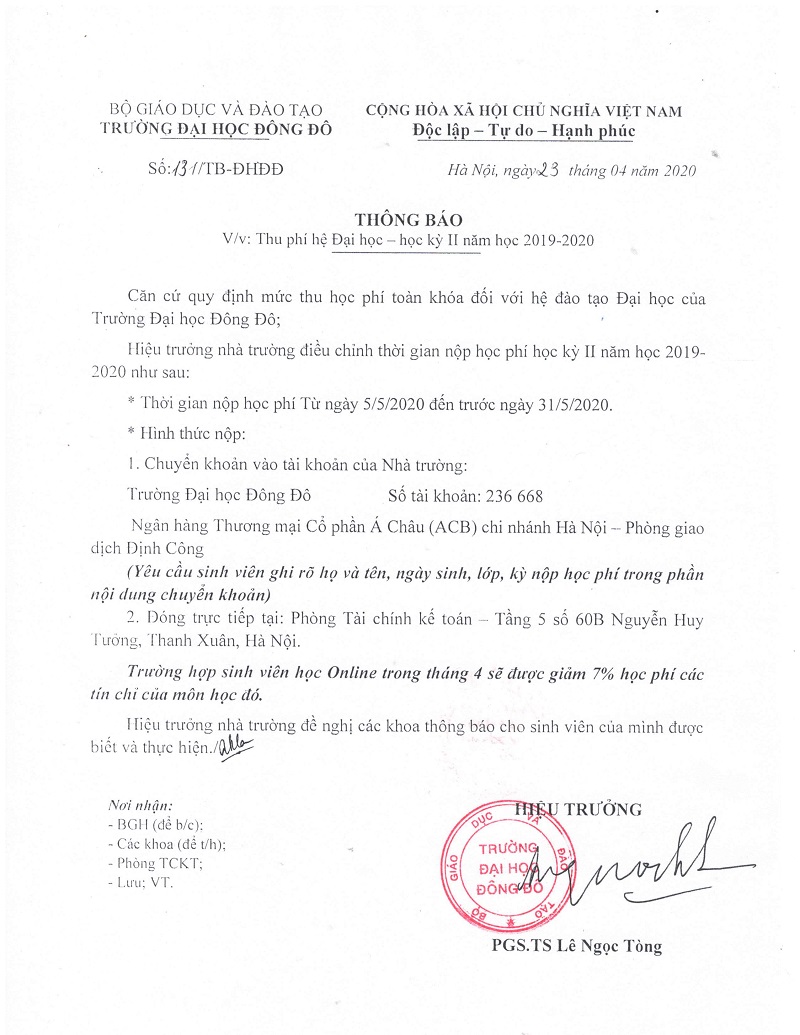 PGS,TS. Lê Ngọc Tòng, Hiệu trưởng Trường Đại học Đông Đô cho biết, trước diễn biến phức tạp của dịch Covid-19, để giúp sinh viên hoàn thành kế hoạch học tập, giảm bớt những khó khăn tài chính, nhà trường quyết định có các chương trình hỗ trợ tài chính đối với người học theo tinh thần cả nước cùng chống dịch.