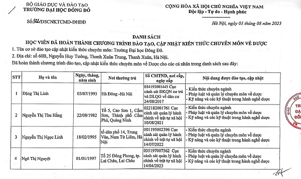 Danh sách học viên đã hoàn thành chương trình đào tạo, cập nhật kiến thức chuyên môn về Dược tháng 8 năm 2023