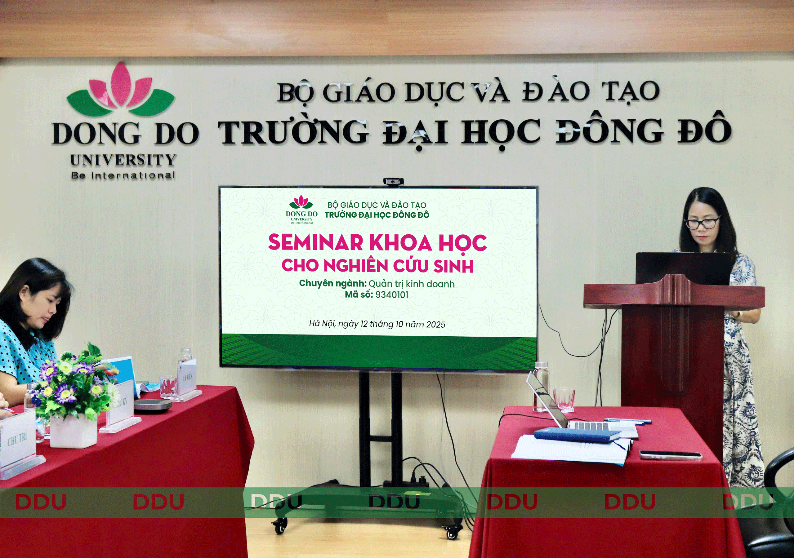 Sáng ngày 12/10/2025, tại Trường Đại học Đông Đô, Viện Đào tạo Sau đại học đã tổ chức Seminar góp ý cho dự thảo luận án của nghiên cứu sinh ngành Quản trị kinh doanh. Đại học Đông Đô tổ chức Seminar Khoa học hành cho nghiên cứu sinh ngành Quản trị kinh doanh - Tăng cường chất lượng đào tạo Sau đại học Đây là một trong các hoạt động nằm trong quy chế đào tạo nghiên cứu sinh của Nhà trường nhằm giúp cho nghiên cứu sinh hoàn thiện luận án một cách tốt nhất, ngoài ra còn tạo một sân chơi khoa học cho công đồng các nhà khoa học trong và ngoài trường, thúc đẩy tinh thần nghiên cứu và tăng cường kết nối giữa các nhà khoa học, giảng viên và học viên Sau đại học. Buổi Seminar vinh dự có sự hiện diện của: TS. Nguyễn Anh Tuấn – Phó Hiệu trưởng Nhà trường TS. Lê Văn Chiến – Phó Viện trưởng Viện Đào tạo Sau đại học TS. Nguyễn Đức Vân – Trưởng khoa Kinh tế GS.TS. Phạm Thị Mỹ Dung – Viện trưởng Viện Nghiên cứu, Quản lý Khoa học và Công nghệ Cùng với đó là sự tham gia của nhiều giảng viên, nhà khoa học đến từ các trường đại học, viện nghiên cứu: PGS.TS. Đàm Gia Mạnh (ĐH Đông Đô), PGS.TS. Lục Mạnh Hiển, PGS.TS. Nguyễn Quang Vĩnh, TS. Lương Xuân Dương, TS. Vũ Thùy Linh, TS. Ngô Thị Minh, TS. Trần Văn Hải… Phát biểu khai mạc, TS. Nguyễn Anh Tuấn – Phó Hiệu trưởng Nhà trường nhấn mạnh: “Seminar nghiên cứu sinh là hoạt động quan trọng trong chương trình đào tạo tiến sĩ của Nhà trường. Đây không chỉ là dịp để các nghiên cứu sinh trình bày kết quả bước đầu của đề tài, mà còn là cơ hội quý báu để tiếp nhận góp ý chuyên môn từ các chuyên gia, hoàn thiện công trình nghiên cứu cả về nội dung và phương pháp.” TS. Nguyễn Anh Tuấn – Phó Hiệu trưởng Nhà trường phát biểu Trong chương trình, 04 nghiên cứu sinh gồm Phạm Hoàng Hải, Trần Thị Hương, Hồ Duy Xuyên, Đặng Đình Tiến đã trình bày kết quả nghiên cứu của mình trước Hội đồng khoa học. Các đề tài được đánh giá cao về tính thực tiễn, khả năng ứng dụng và giá trị đóng góp cho lĩnh vực chuyên ngành. Nghiên cứu sinh gồm Trần Thị Hương trình bày kết quả nghiên cứu trước Hội đồng khoa học Buổi Seminar diễn ra trong không khí học thuật nghiêm túc, cởi mở và hiệu quả – nơi các nghiên cứu sinh thể hiện năng lực nghiên cứu độc lập, đồng thời lắng nghe những góp ý sâu sắc từ các nhà khoa học, qua đó giúp cho các nghiên cứu sinh tiếp tục chỉnh sửa, hoàn thiện luận án của mình. Kết thúc chương trình, Ban Tổ chức gửi lời cảm ơn trân trọng tới các nhà khoa học, giảng viên và nghiên cứu sinh đã tham dự, đóng góp ý kiến chuyên môn quý báu, cùng nhau góp phần nâng cao chất lượng đào tạo và khẳng định vị thế của Viện Đào tạo Sau đại học – Trường Đại học Đông Đô trong lĩnh vực đào tạo tiến sĩ và phát triển học thuật..png)