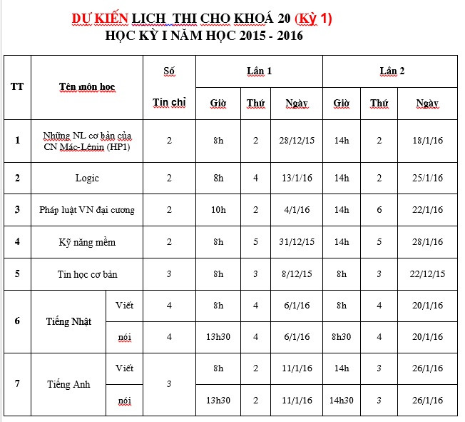 Dự kiến lịch thi kì 1 khóa 20 (2015 - 2016)
