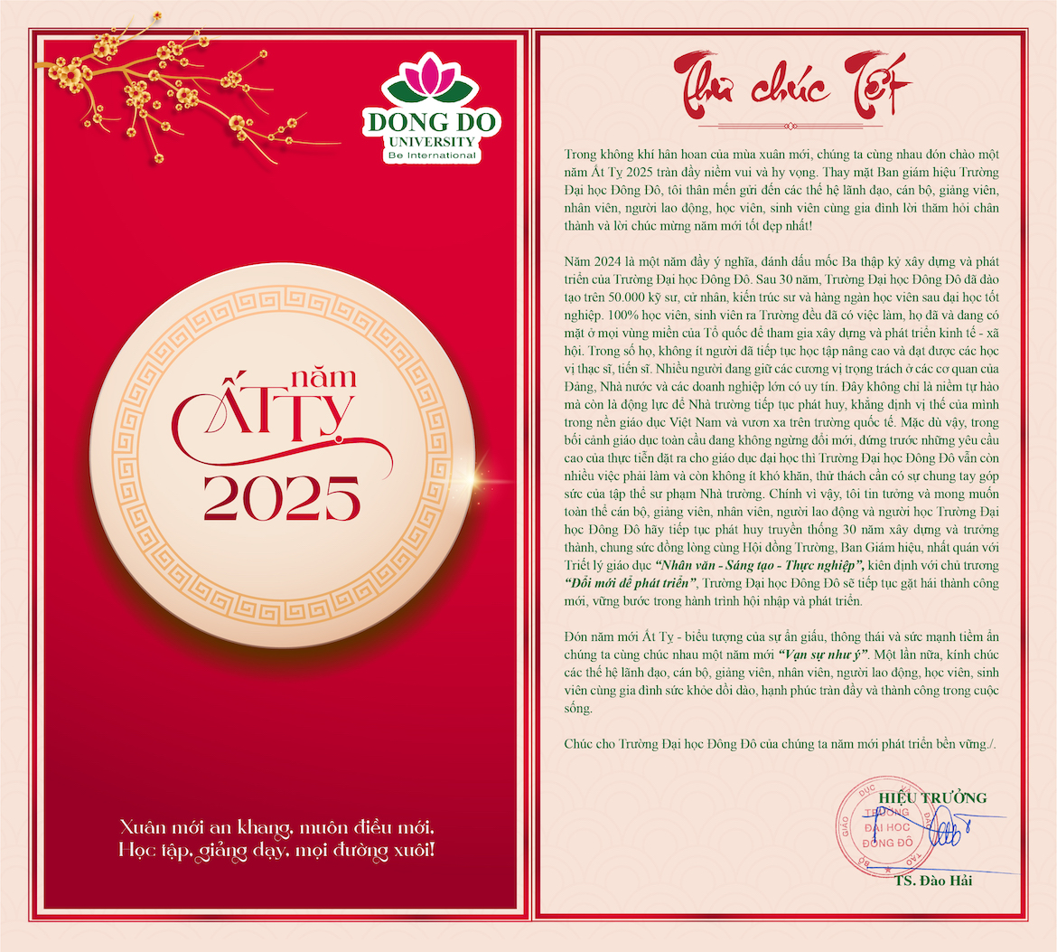 Trong không khí hân hoan của mùa xuân mới, chúng ta cùng nhau đón chào một năm Ất Tỵ 2025 tràn đầy niềm vui và hy vọng. Thay mặt Ban giám hiệu Trường Đại học Đông Đô, tôi thân mến gửi đến các thế hệ lãnh đạo, cán bộ, giảng viên, nhân viên, người lao động, học viên, sinh viên cùng gia đình lời thăm hỏi chân thành và lời chúc mừng năm mới tốt đẹp nhất!