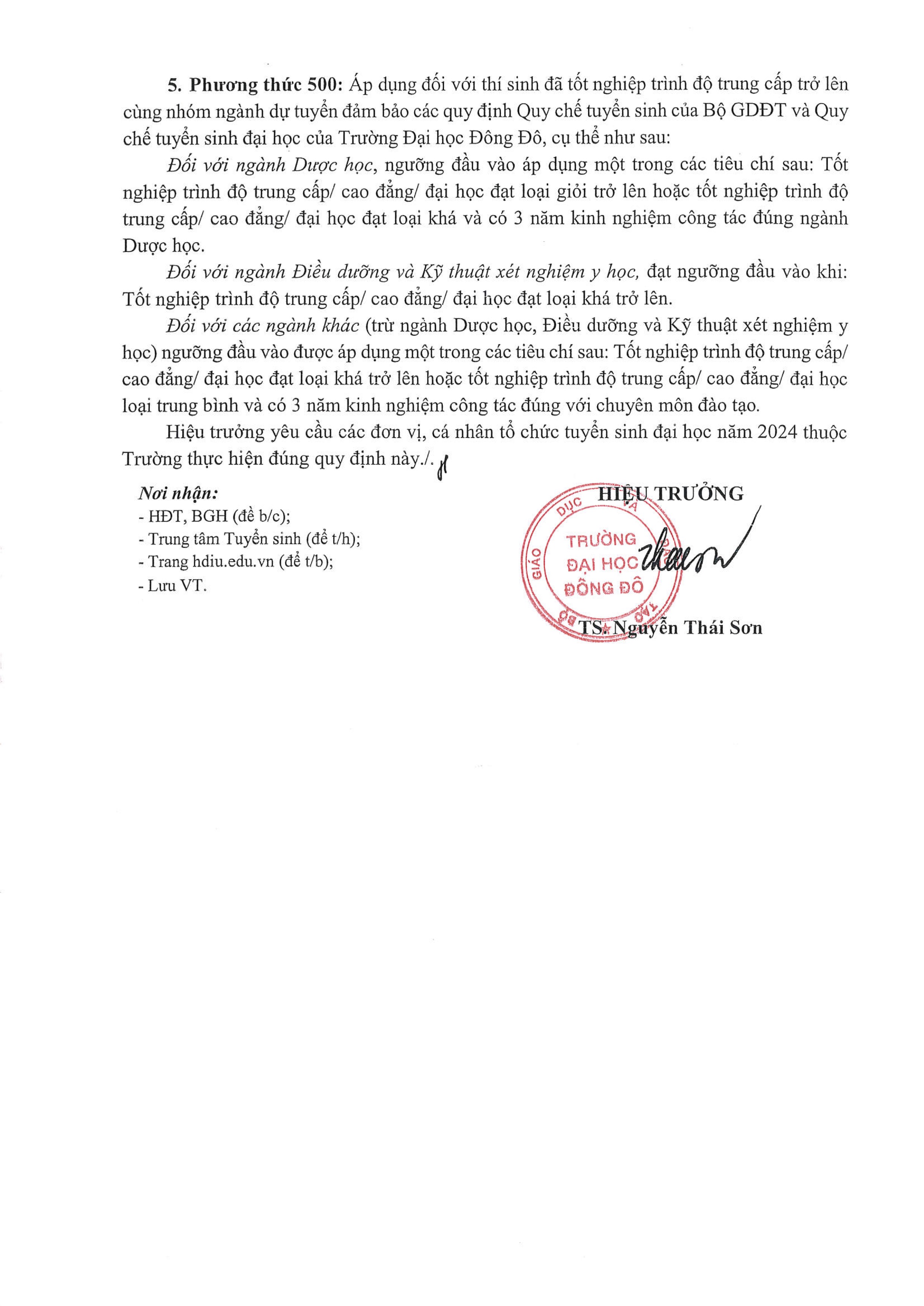 Hội đồng tuyển sinh Trường Đại học Đông Đô công bố ngưỡng điểm nhận hồ sơ xét tuyển (điểm sàn) Đại học hệ chính quy năm 2024