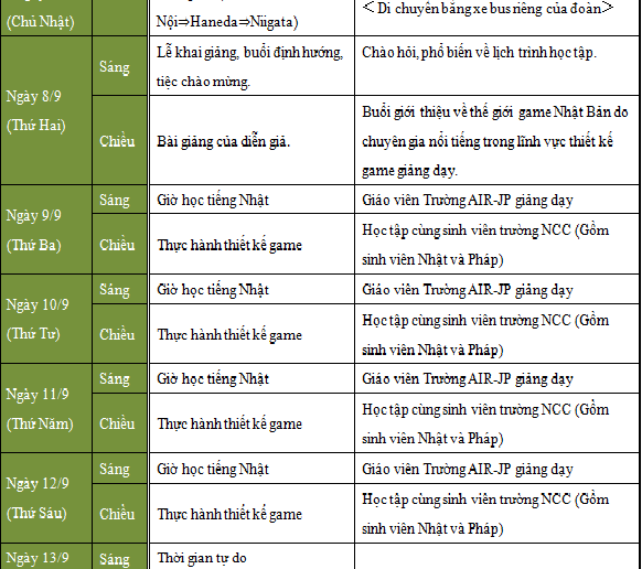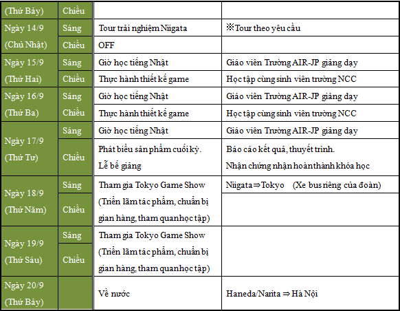 Là chương trình dành cho các bạn sinh viên say mê công nghệ thông tin có cơ hội được tìm hiểu về thế giới game Nhật Bản thông qua các bài giảng của các chuyên gia về thiết kế game, thiết kế đồ họa. Sinh viên tham gia chương trình sẽ cùng sinh viên Nhật Bản học tập tại trường NCC (Trường chuyên ngành máy tính Niigata), và AIR-JP (Khoa tiếng Nhật, Trường tiếng Nhật - Du lịch - Hàng không). Dưới sự hướng dẫn của các chuyên gia, các bạn sinh viên tự thiết kế các sản phẩm game của riêng mình và mang tới triển lãm tại Tokyo Game Show. Trực tiếp tham gia các công tác chuẩn bị và tổ chức triển lãm cùng các sinh viên khác.