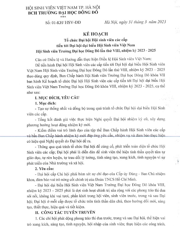 Kế hoạch tổ chức Đại hội Hội Sinh viên Trường Đại học Đông Đô lần thứ VIII (2023 - 2025)
