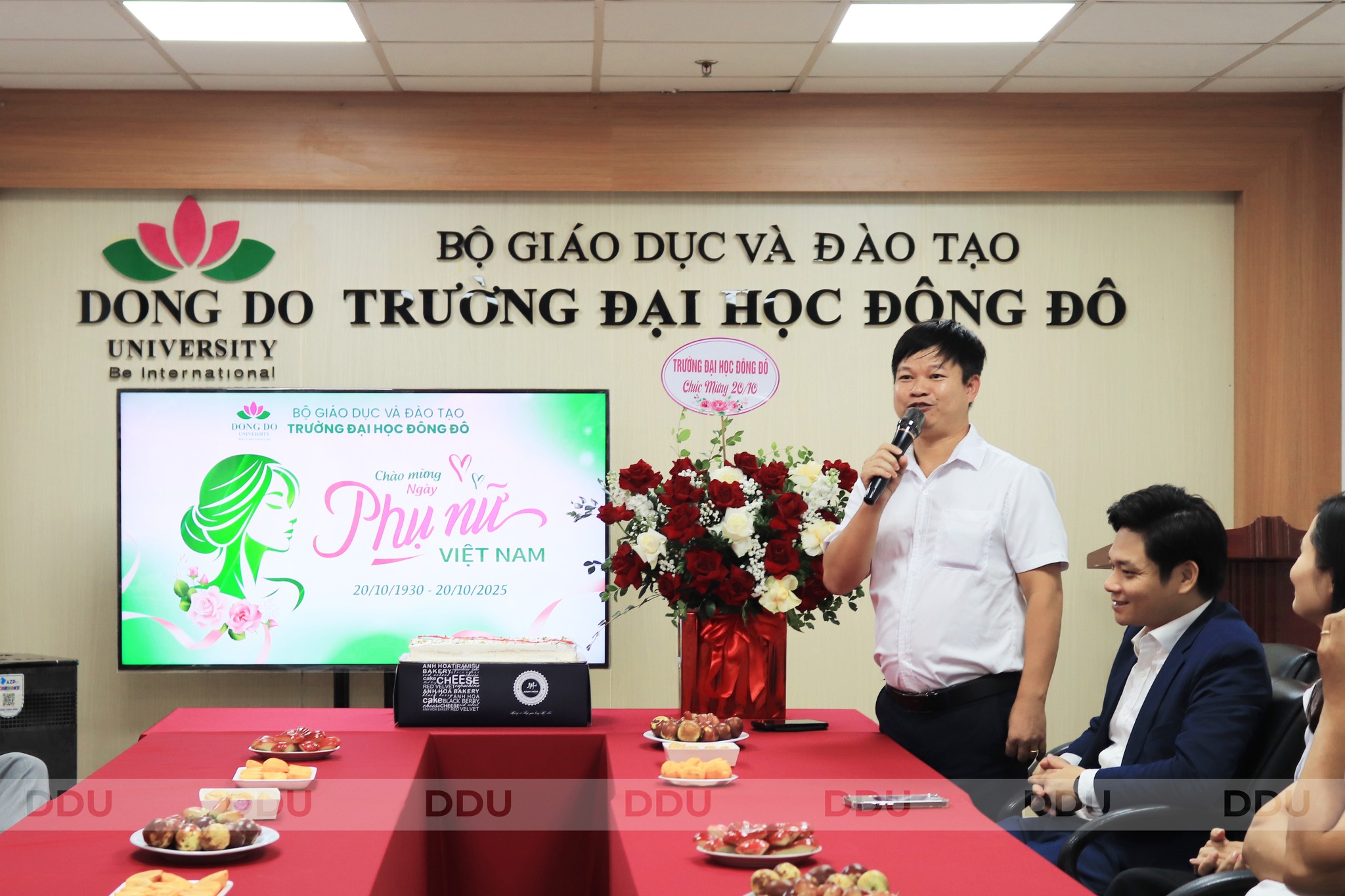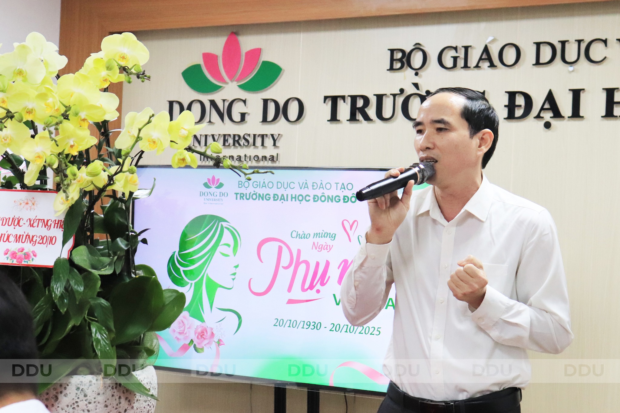Mở đầu chương trình, đại diện Ban Giám hiệu, Thầy Nguyễn Đình Tân gửi tới toàn thể phái đẹp lời chúc mừng nồng ấm, ghi nhận và tri ân những nỗ lực, cống hiến của các nữ cán bộ, giảng viên, nhân viên và sinh viên trong sự nghiệp giáo dục và phát triển bền vững của Trường Đại học Đông Đô.