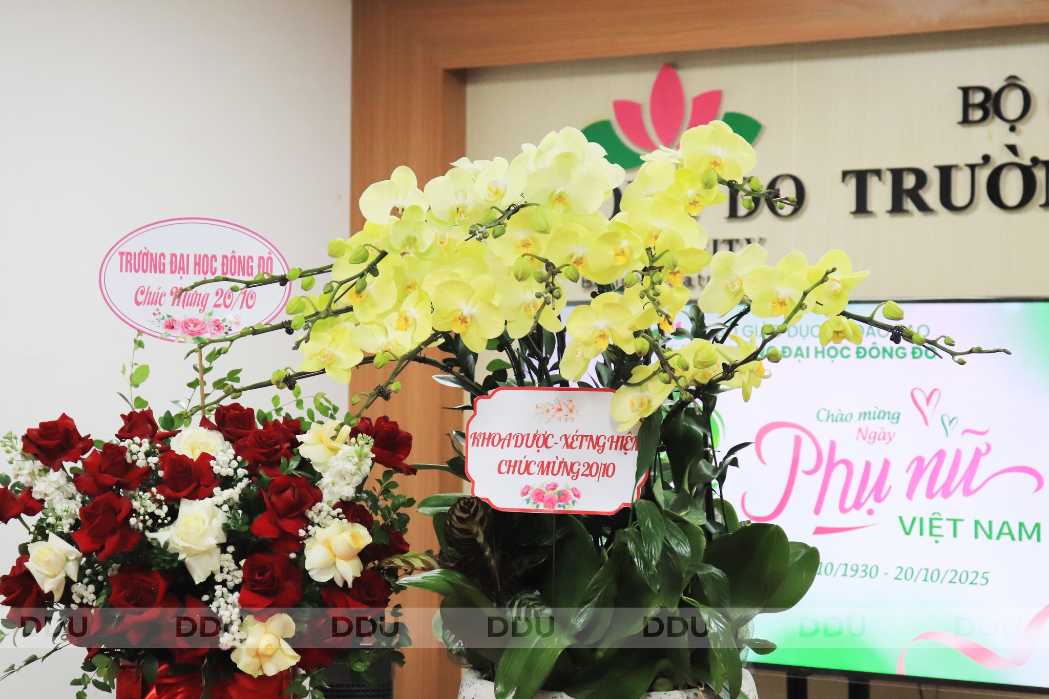 Cũng trong chương trình, Khoa Dược – Xét nghiệm đã đại diện gửi lẵng hoa chúc mừng Nhà trường, thể hiện tinh thần đoàn kết, sẻ chia và gắn bó trong tập thể sư phạm Đông Đô.
