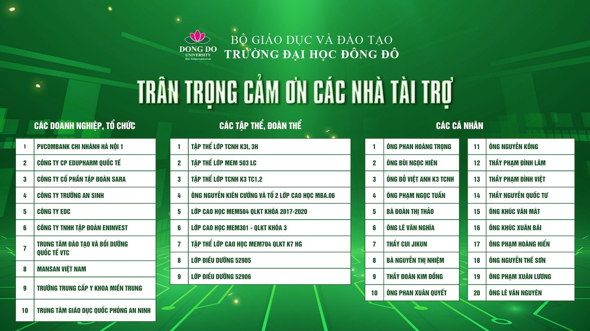 Thay mặt Trường Đại học Đông Đô, BTC lễ kỷ niệm 30 năm thành lập xin gửi lời cảm ơn sâu sắc tới các các cá nhân, đơn vị, tập thể, tổ chức, doanh nghiệp đã đồng hành và ủng hộ sự kiện trọng đại này. Sự hỗ trợ của Quý vị không chỉ giúp sự kiện được tổ chức thành công mà còn là nguồn động viên to lớn để nhà trường tiếp tục phấn đấu, không ngừng nâng cao chất lượng đào tạo và nghiên cứu khoa học, góp phần vào sự phát triển của giáo dục nước nhà.