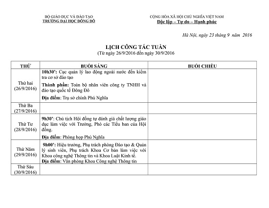 Lịch làm việc từ 26/09/2016 đến 30/09/2016
