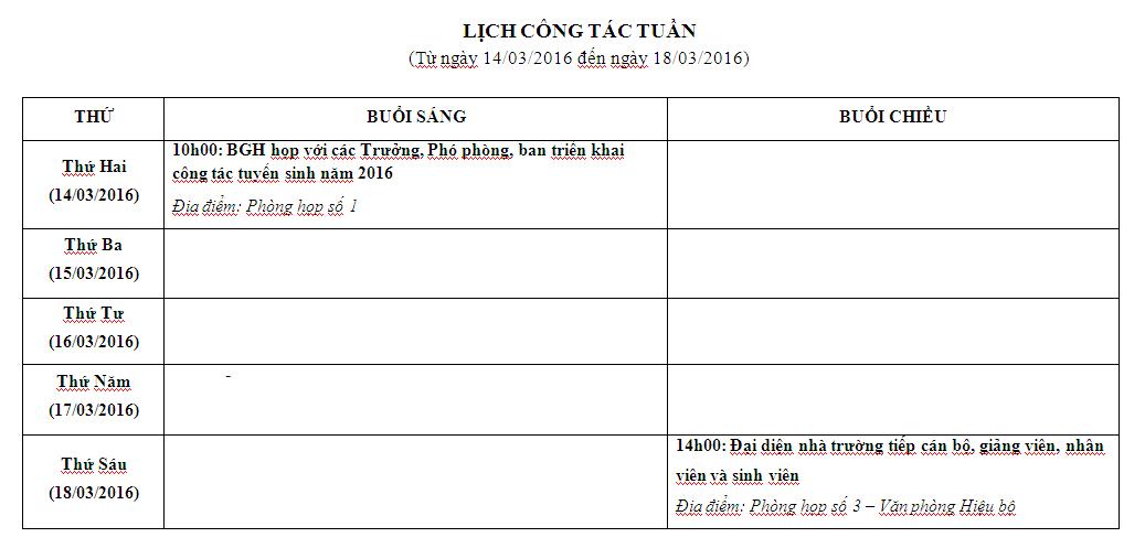 Lịch làm việc từ ngày 14/03/2016 - 18/03/2016
