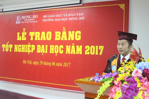Trong niềm vui ngày tốt nghiệp, tân Cử nhân Đặng Thị Hoa, tốt nghiệp ngành Quan hệ quốc tế đại diện cho các tân cử nhân được vinh danh và trao bằng tốt nghiệp phát biểu, bày tỏ lòng biết ơn sâu sắc tới Ban Giám hiệu nhà trường, các thầy cô giáo đã tận tâm truyền đạt những kiến thức, kỹ năng trong suốt quá trình học tập tại trường và xin hứa sẽ đem những kiến thức đã được học, vận dụng sáng tạo vào công việc và cuộc sống để không phụ lòng mong đợi của thầy cô, gia đình, xứng đáng với truyền thống vẻ vang của trường Đại học Đông Đô thân yêu.
