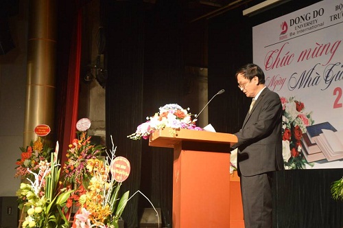 Tại buổi chào mừng, PGS.TS. NGUT. Phạm Đình Phùng gửi lời chúc đến toàn thể các nhà giáo lão thành, thầy cô giáo cơ hữu, thầy cô giáo thỉnh giảng và cán bộ, nhân viên của trường. Giáo dục là sự nghiệp quan trọng đối với sự phát triển của nhân loại, chính vì vậy, từ ngàn xưa tinh thần tôn sư trọng đạo đã là một nét truyền thống, nét văn hóa của các dân tộc. Trước chương trình chào mừng này, lãnh đạo trường Đại học Đông Đô đã tổ chức chuỗi hoạt động để chúc mừng ngày nhà giáo Việt Nam như: “Giải Golf Đại học Đông Đô mở rộng, tọa đàm với chủ đề “Đào tạo theo hệ thống tín chỉ ở trường Đại học Đông Đô từ góc nhìn của giảng viên”, giải đi bộ với chủ đề “Rèn luyện sức khỏe và bảo vệ môi trường”... Thay mặt Hội đồng quản trị, Ban Giám hiệu nhà trường, thầy Hiệu trưởng ghi nhận và cảm ơn những đóng góp của các thầy cô giáo vào thành tích mà trường đã đạt đươc trong suốt 21 năm xây dựng và phát triển.