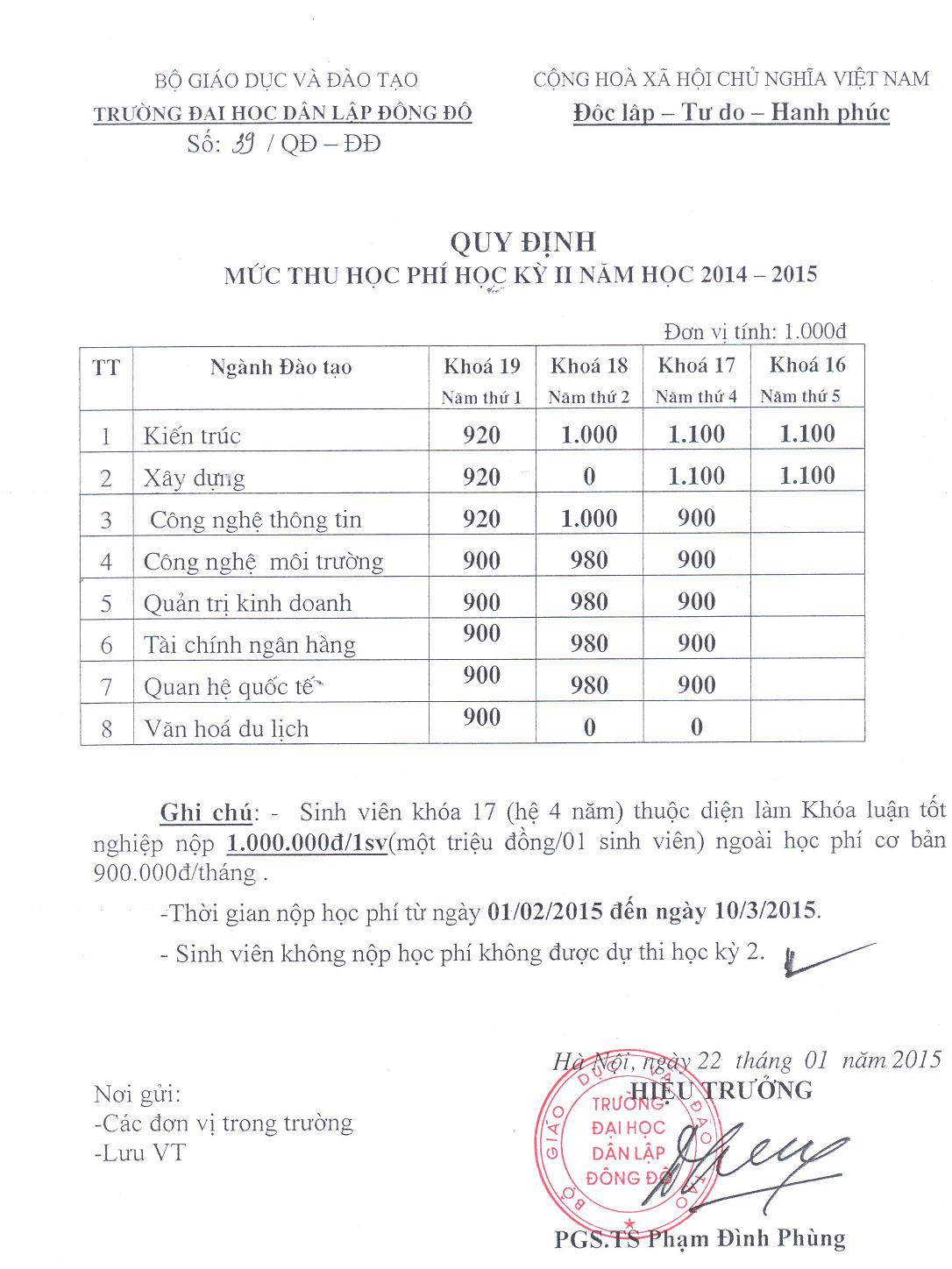 Quy định mức học phí học kỳ II năm học 2014 - 2015