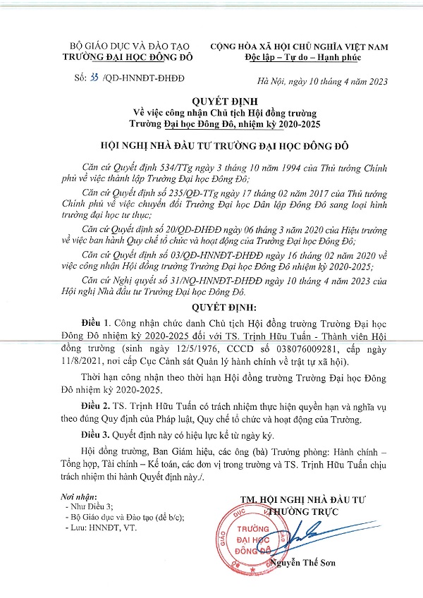 Quyết định công nhận Chủ tịch Hội đồng trường Trường Đại học Đông Đô, nhiệm kỳ 2020-2025