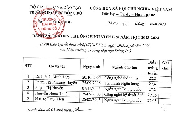 Quyết định khen thưởng sinh viên có điểm đầu vào cao nhất Khóa 28, năm học 2023 - 2024