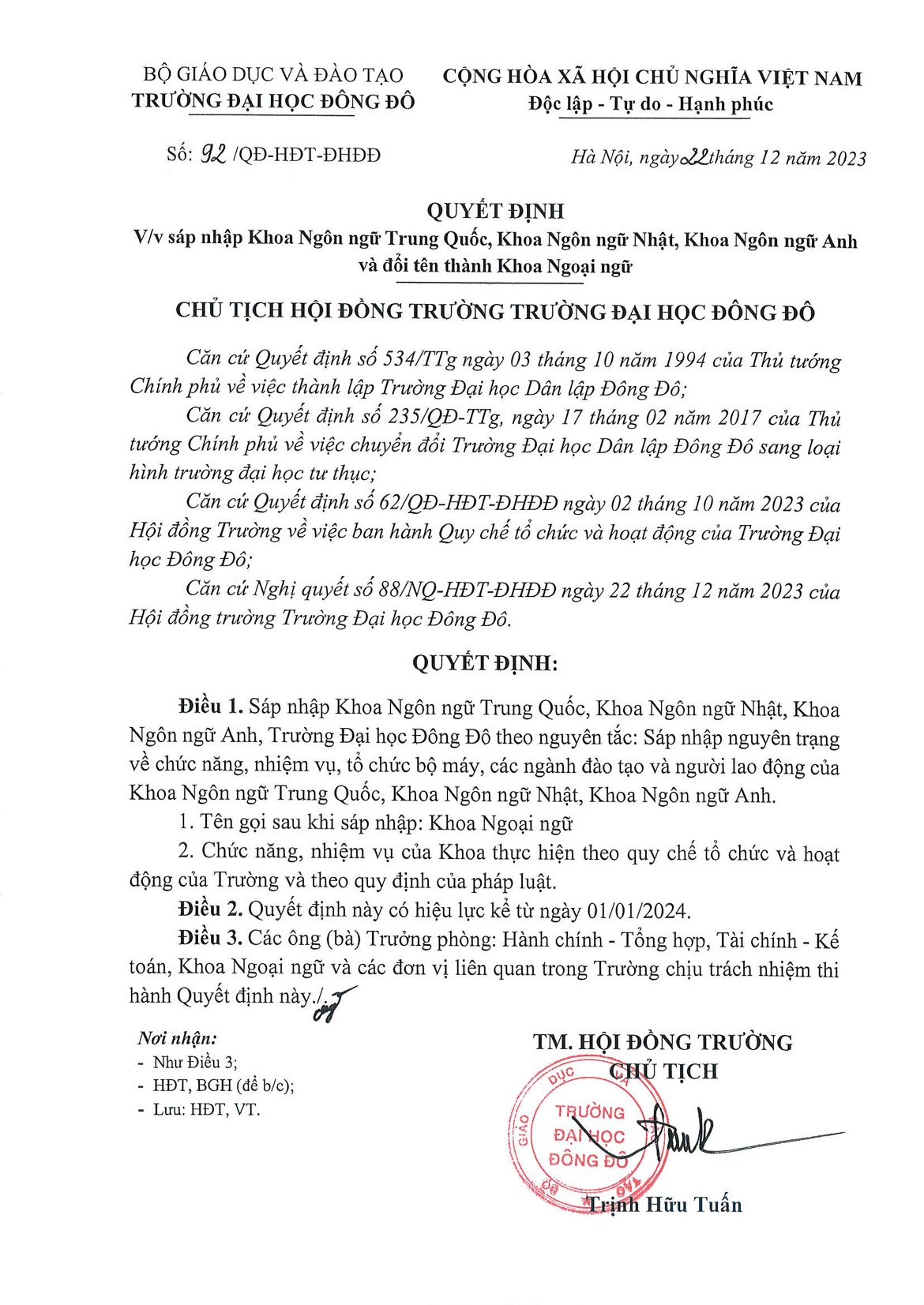 Theo đó sau khi sáp nhập, Khoa Ngoại ngữ sẽ thực hiện chức năng nhiệm vụ theo quy chế tổ chức và hoạt động của Trường. Chi tiết về quyết định sáp nhập tham khảo dưới đây.