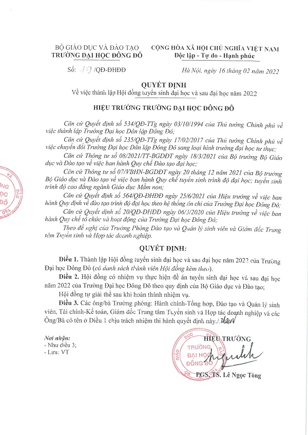Quyết định thành lập Hội đồng tuyển sinh đại học và sau đại học năm 2022