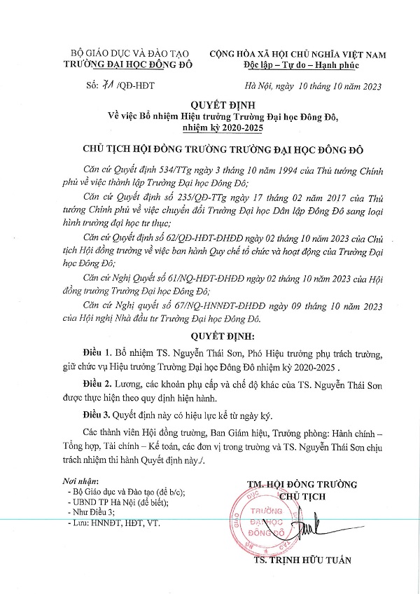 Quyết định về việc Bổ nhiệm Hiệu trưởng Trường Đại học Đông Đô, nhiệm kỳ 2020 - 2025