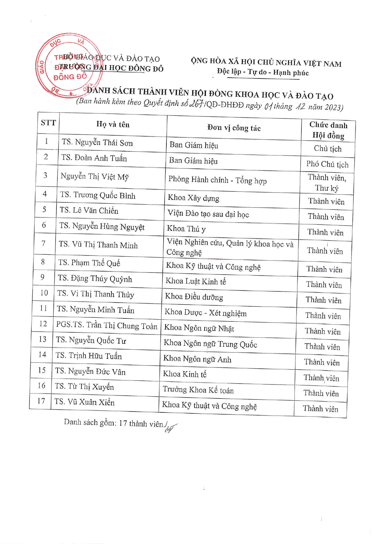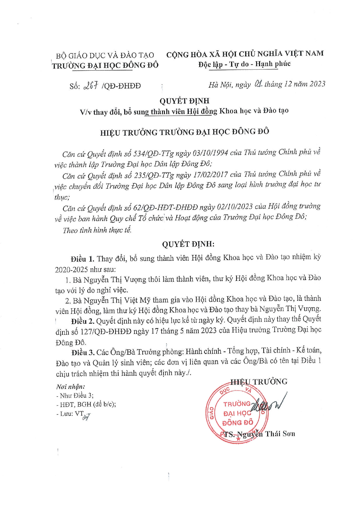 Hiệu trưởng Trường Đại học Đông Đô ban hành quyết định số 267/QĐ-ĐHĐĐ về việc thay đổi, bổ sung thành viên Hội đồng Khoa học và Đào tạo. Chi tiết tại văn bản dưới đây: