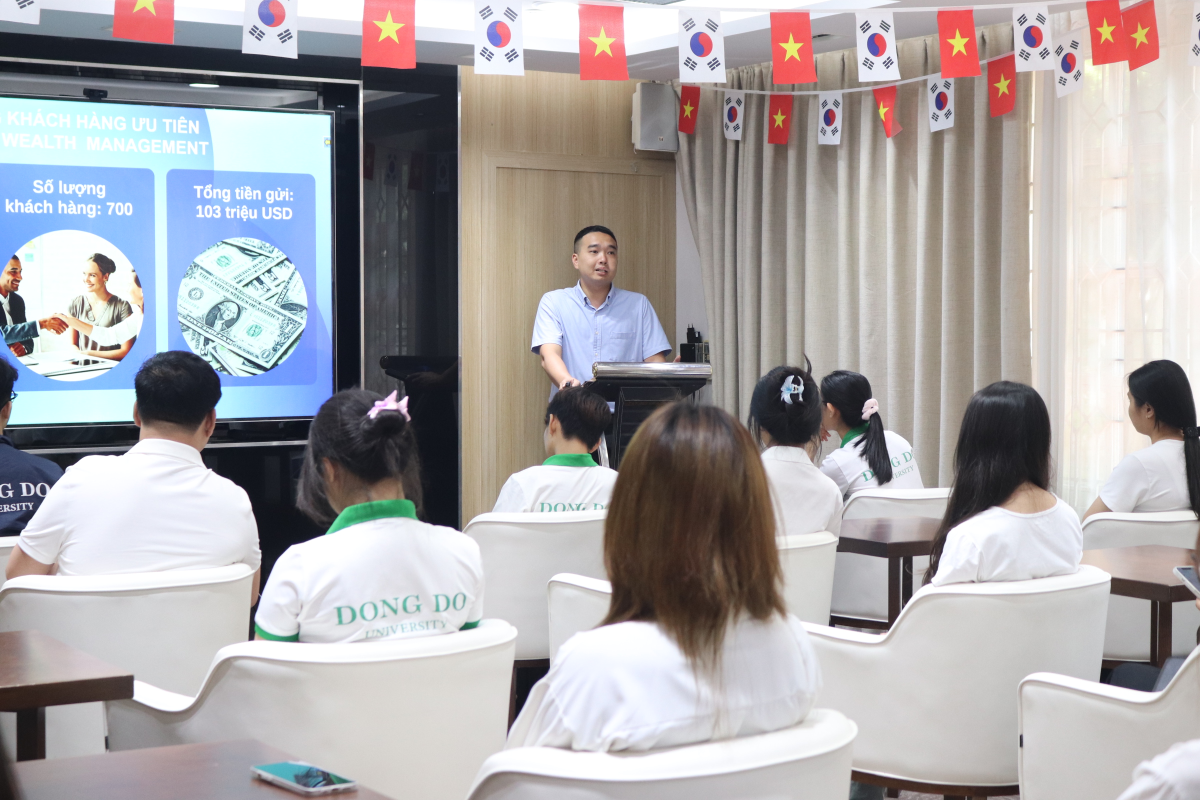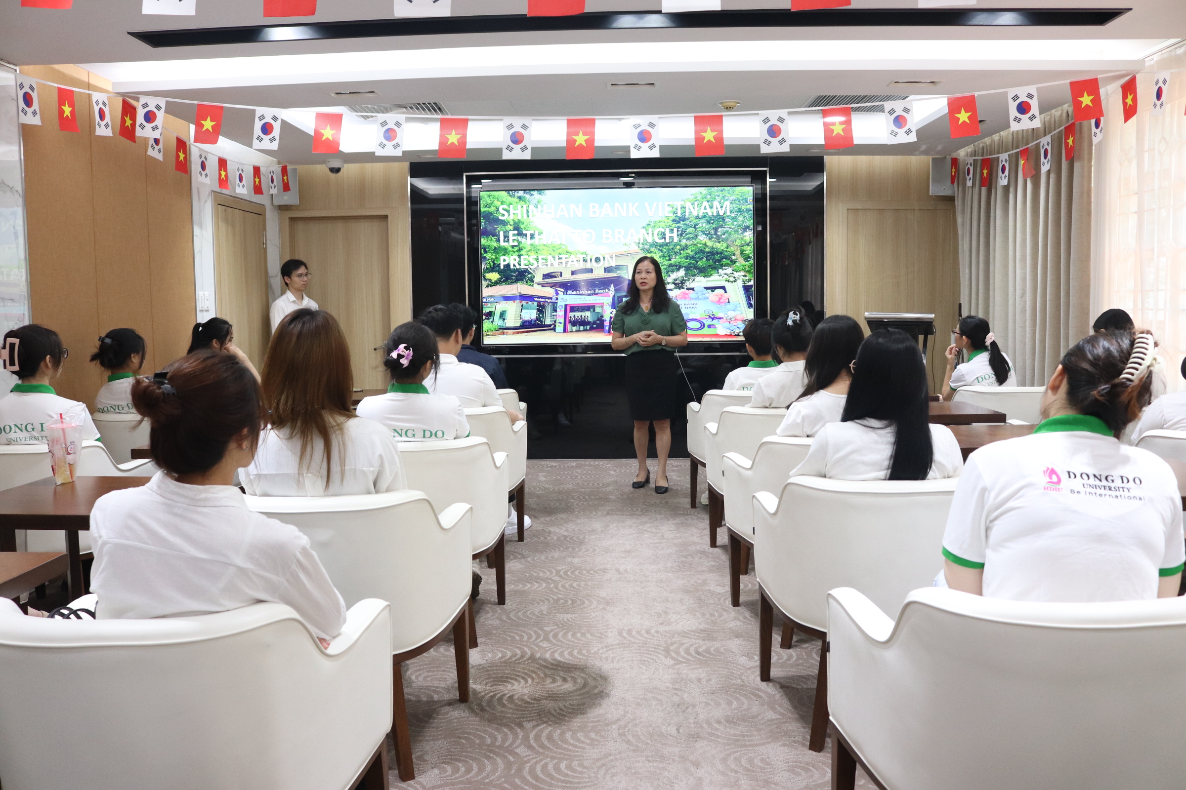 Trong chương trình, các bạn sinh viên đã được tham quan chi nhánh, tìm hiểu về cấu trúc tổ chức, hoạt động nghiệp vụ của ngân hàng, cũng như được giới thiệu về các sản phẩm, dịch vụ đa dạng mà Shinhan Bank cung cấp cho khách hàng.