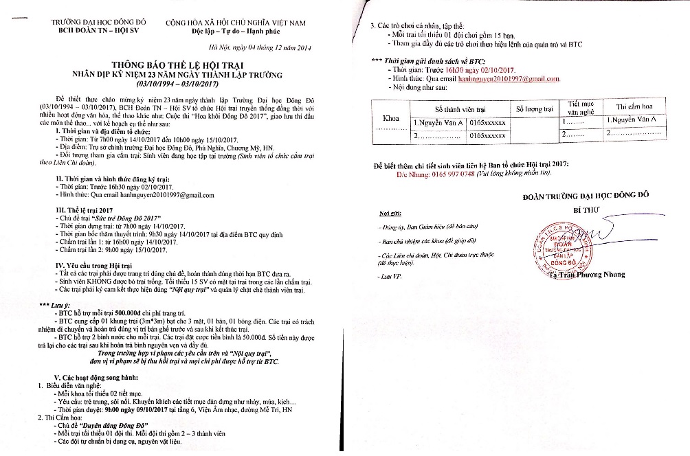 Để thiết thực chào mừng kỷ niệm 23 năm ngày thành lập Trường Đại học Đông Đô (03/10/1994 – 03/10/2017), BCH Đoàn TN – Hội SV tổ chức Hội trại truyền thống đồng thời với nhiều hoạt động văn hóa, thể thao khác như: Cuộc thi “Hoa khôi Đông Đô 2017”, giao lưu thi đấu các môn thể thao... với kế hoạch cụ thể như sau: