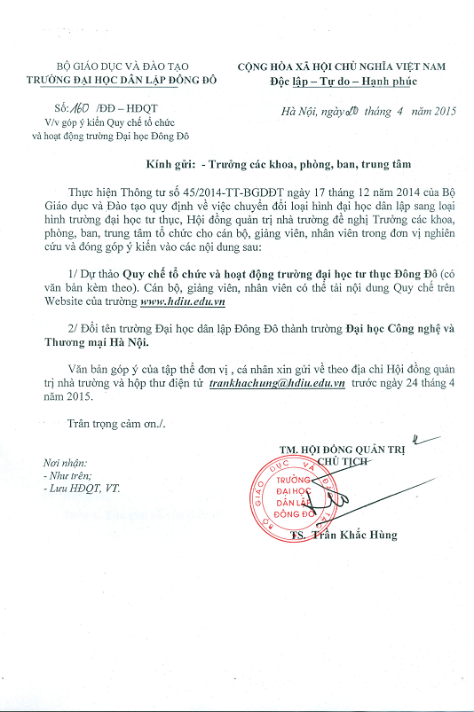 Thông báo : Góp ý kiến Quy chế tổ chức và hoạt động trường Đại học Đông Đô