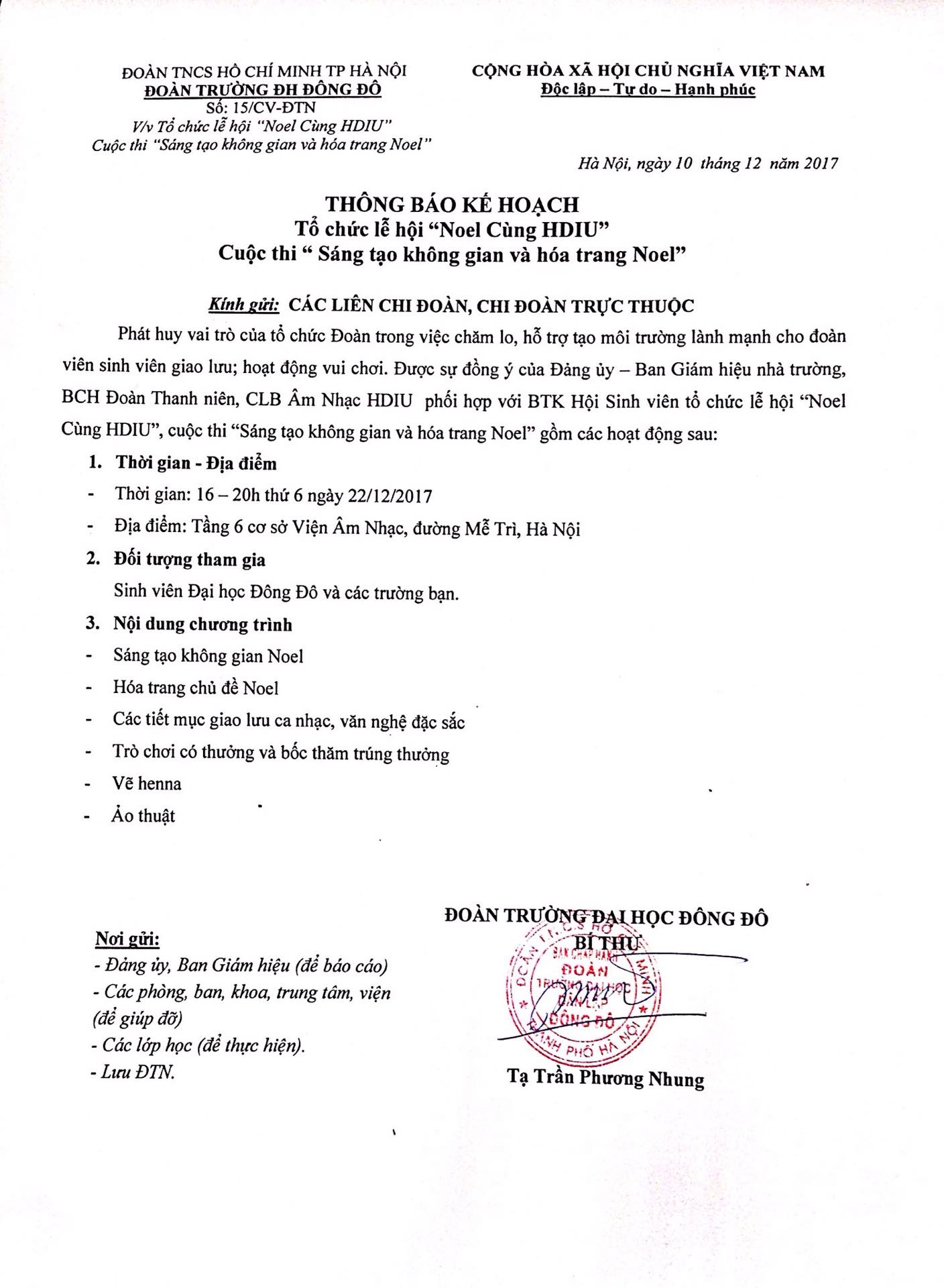 Phát huy vai trò của tổ chức Đoàn trong việc chăm lo, hỗ trợ tạo môi trường lành mạnh cho đoàn viên sinh viên giao lưu; hoạt động vui chơi. Được sự đồng ý của Đảng ủy – Ban Giám hiệu nhà trường, BCH Đoàn Thanh niên, CLB Âm Nhạc HDIU phối hợp với BTK Hội Sinh viên tổ chức lễ hội “Noel Cùng HDIU”, cuộc thi “Sáng tạo không gian và hóa trang Noel” gồm các hoạt động sau: