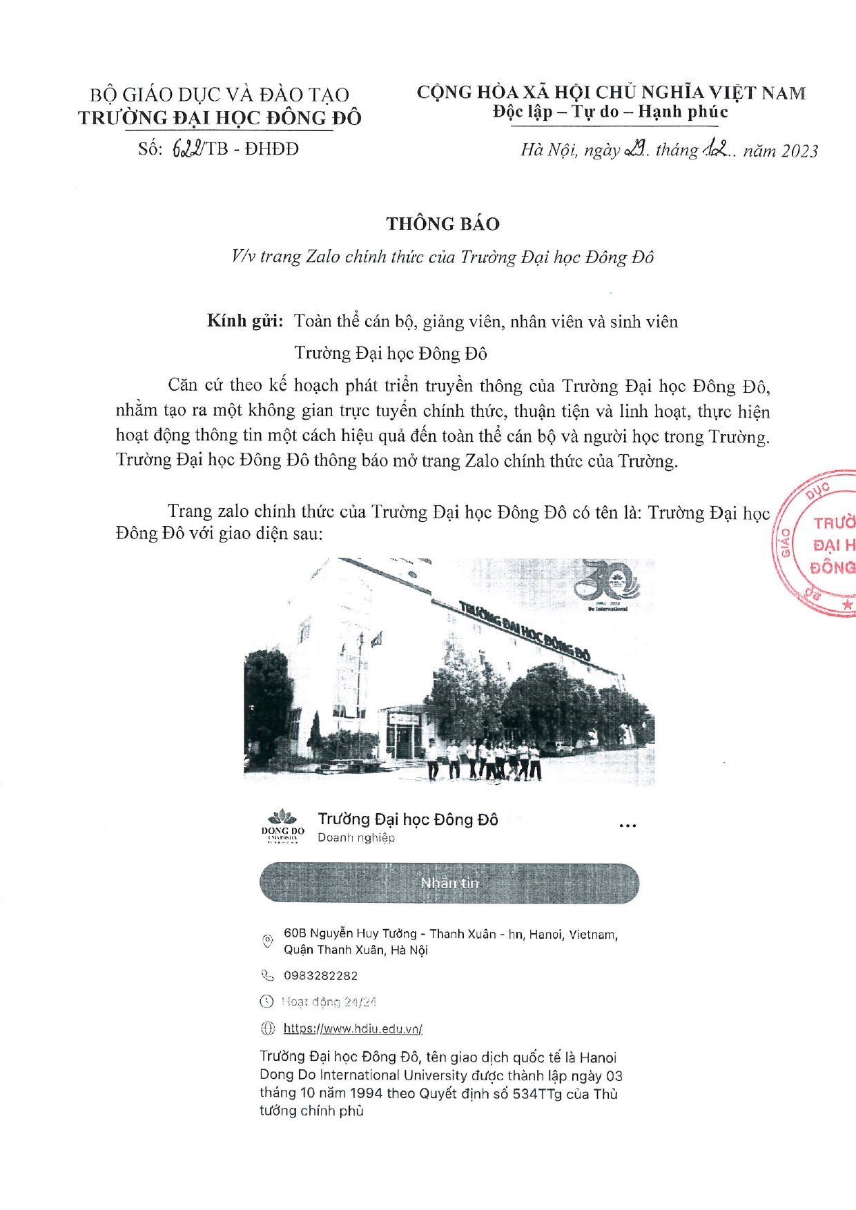 Thông báo số 622/TB - ĐHĐĐ về việc mở trang Zalo chính thức của trường Đại học Đông Đô. Căn cứ theo kế hoạch phát triển truyền thông của Trường Đại học Đông Đô, nhằm tạo ra một không gian trực tuyến chính thức, thuận tiện và linh hoạt, thực hiện hoạt động thông tin một cách hiệu quả đến toàn thể cán bộ và người học trong Trường. Chi tiết đọc tại văn bản dưới đây: