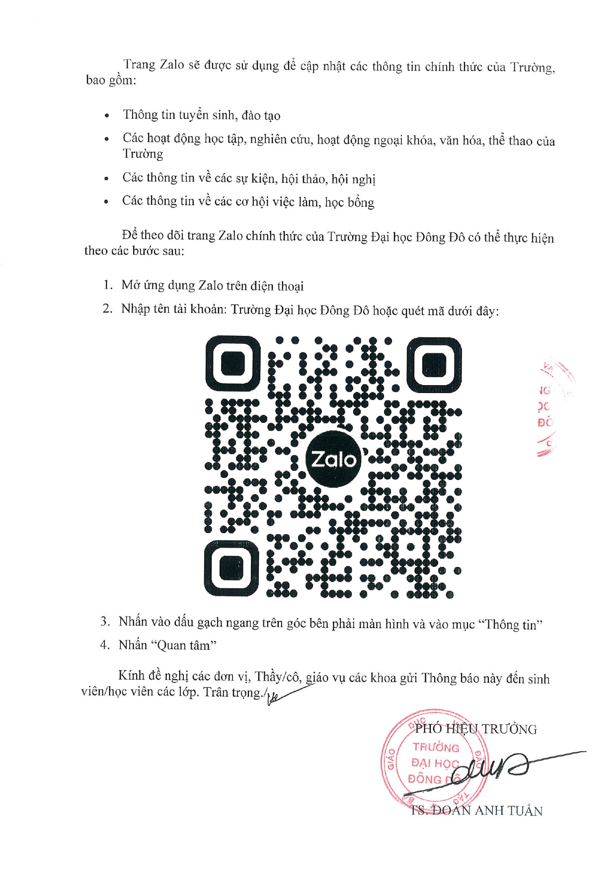 Thông báo trang Zalo chính thức của Trường Đại học Đông Đô