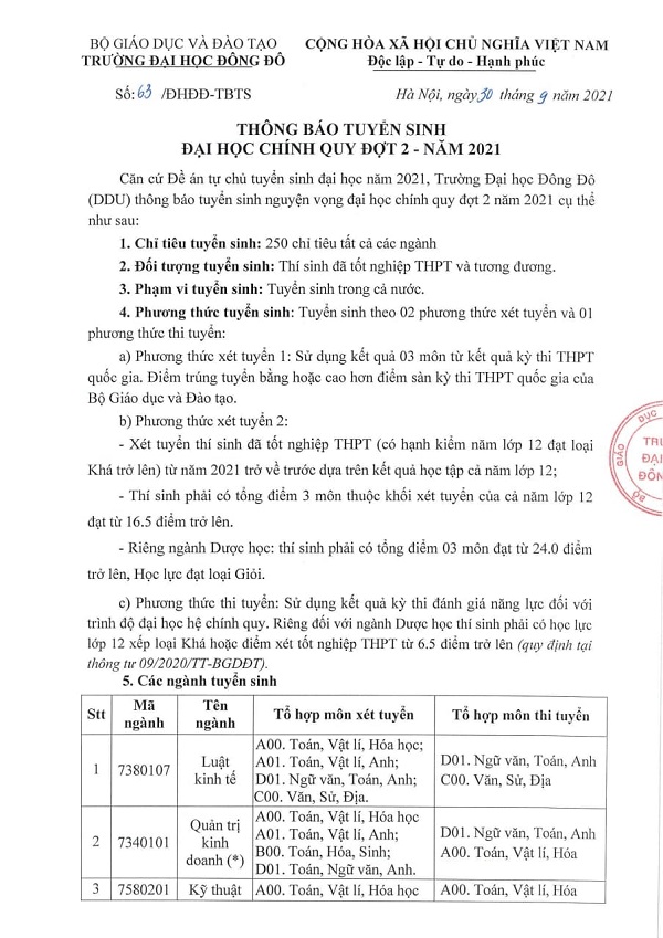 Thông báo tuyển sinh đại học chính quy đợt 2 năm 2021