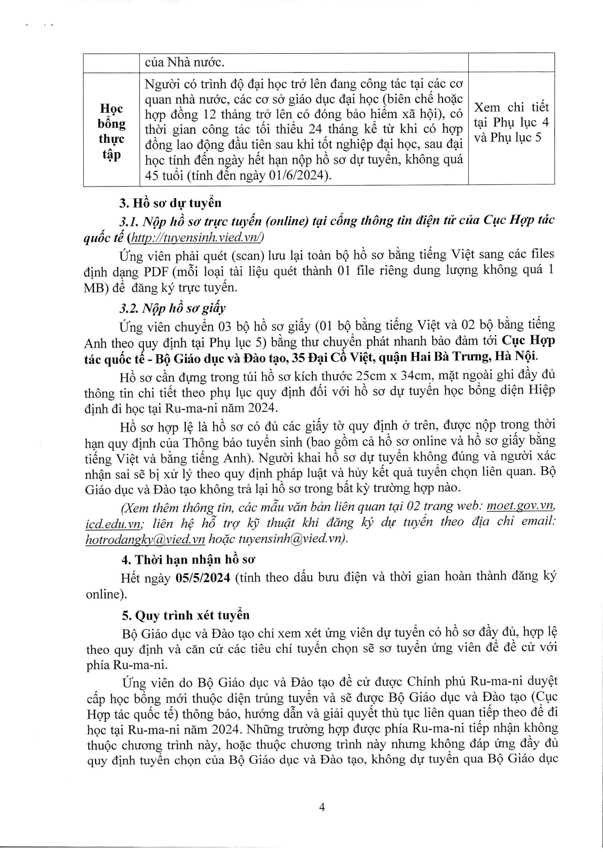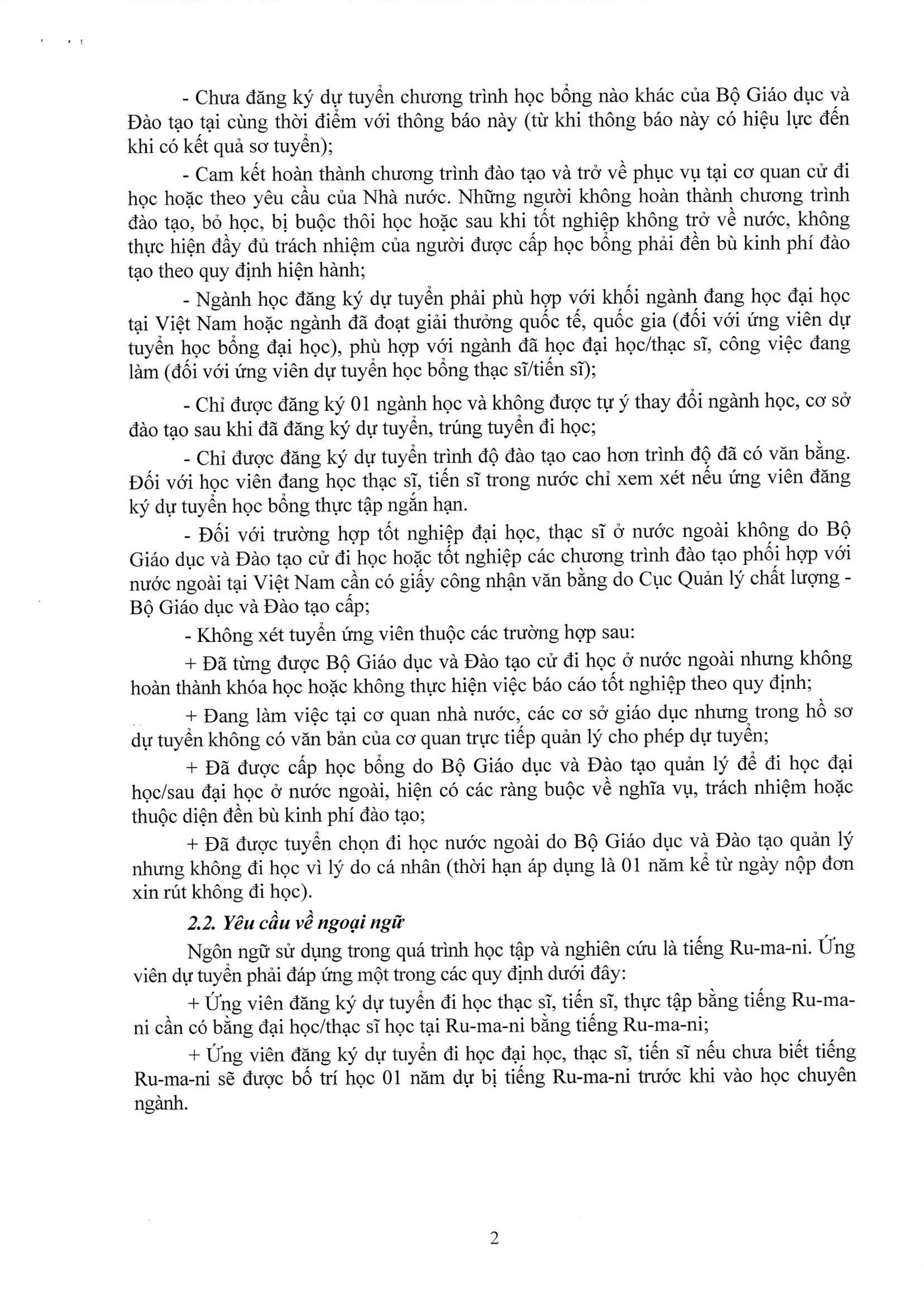 Căn cứ Thông tư số 06/2016/TT-BGDĐT ngày 21/3/2016 của Bộ trưởng Bộ Giáo dục và Đào tạo ban hành Quy chế tuyển sinh đi học nước ngoài (Thông tư số 06) và Thông tư số 18/2022/TT-BGDĐT ngày 15/12/2022 sửa đổi, bổ sung một số điều của Quy chế tuyển sinh đi học nước ngoài ban hành kèm theo Thông tư số 06; Căn cứ Chương trình hợp tác trong lĩnh vực giáo dục và đào tạo giữa Chính phủ nước Cộng hoà xã hội chủ nghĩa Việt Nam và Chính phủ Ru-ma-ni giai đoạn 2022 - 2026, Công hàm số 278 ngày 25/3/2024 của Đại sứ quán Ru-ma-ni tại Hà Nội thông báo chỉ tiêu học bổng của phía Ru-ma-ni, Bộ Giáo dục và Đào tạo thông báo tuyển sinh đi học theo diện Hiệp định tại Ru-ma-ni năm 2024 như sau: