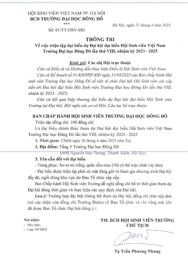 Thông tri Đại hội đại biểu Hội Sinh viên Việt Nam Trường Đại học Đông Đô lần thứ VIII (2023 - 2025)