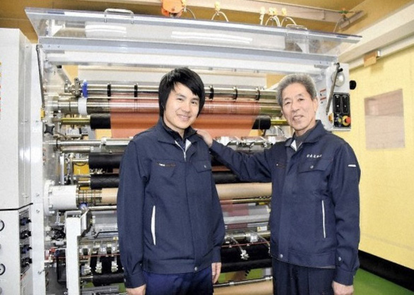 Ông chủ Yasutaka Nagao (phải) chụp ảnh cùng người kế nhiệm mà ông đã chọn lựa là anh công nhân người Việt Nguyễn Đức Trường. Hình ảnh chụp tại xưởng công ty ở quận Nishi tháng 2-2019 - Ảnh: MAINICHI