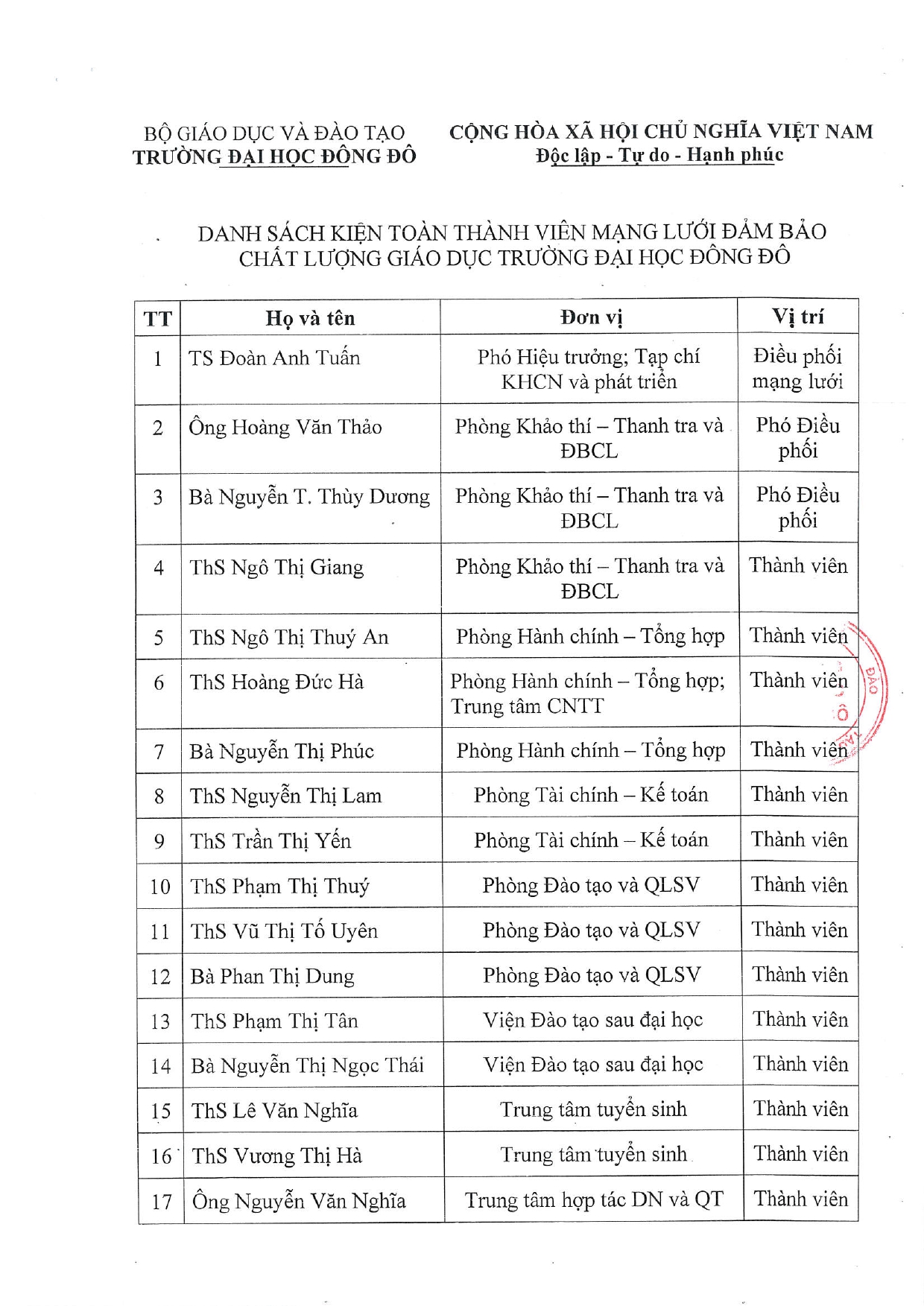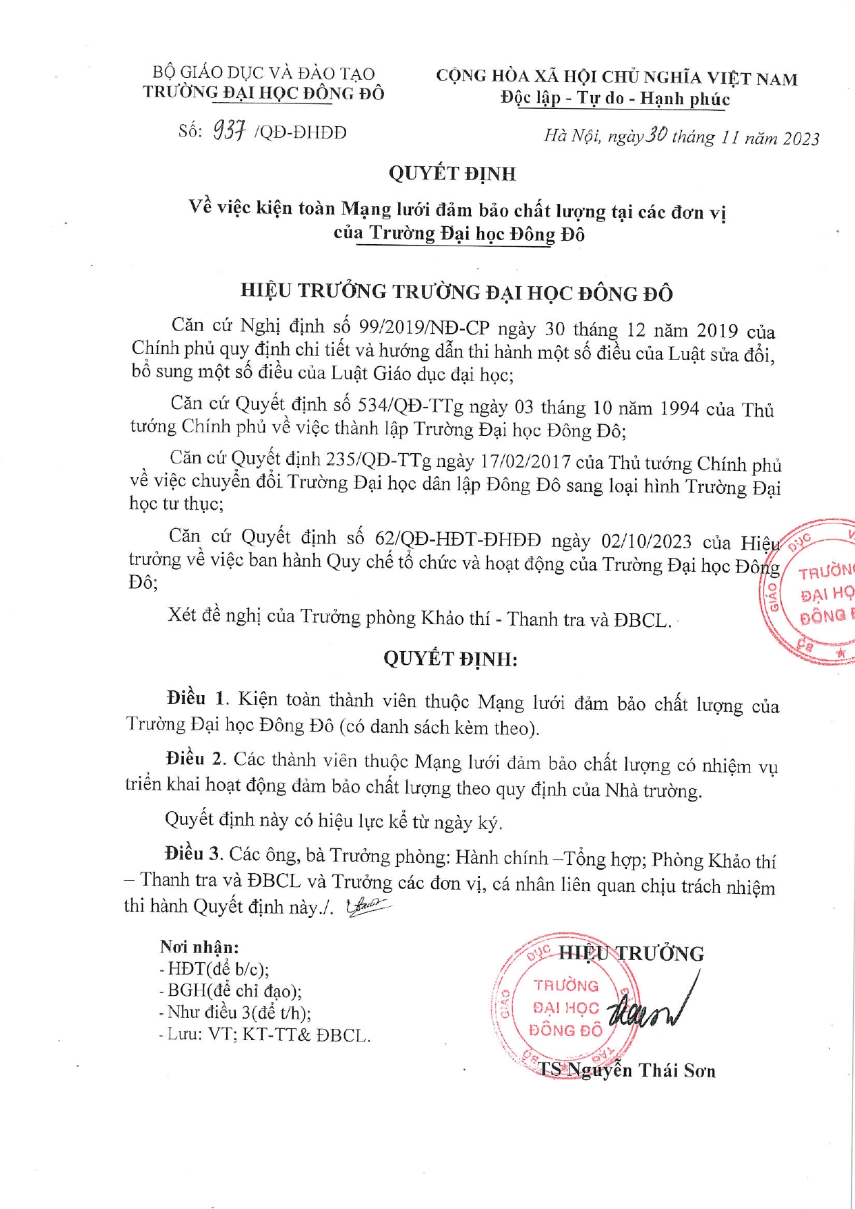 Đại học Đông Đô ra quyết định kiện toàn mạng lưới đảm bảo chất lượng