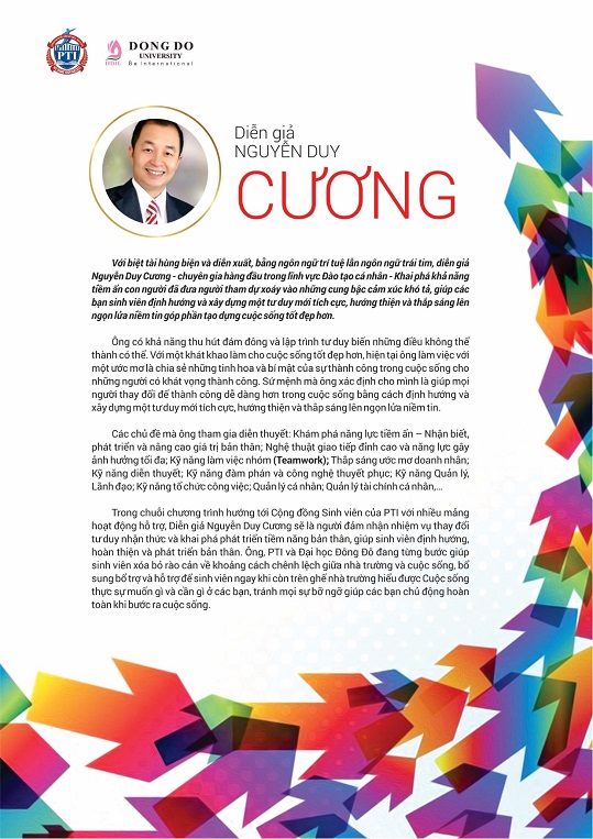 Diễn giả: Nguyễn Duy Cương- Chuyên gia phát triển tiềm năng con người. Thời gian:13H00 - 17 h00. Ngày 24/01/2015. Địa điểm:NHÀ VĂN HÓA HỌC SINH- SINH VIÊN, 37 TRẦN BÌNH TRỌNG, HÀ NỘI