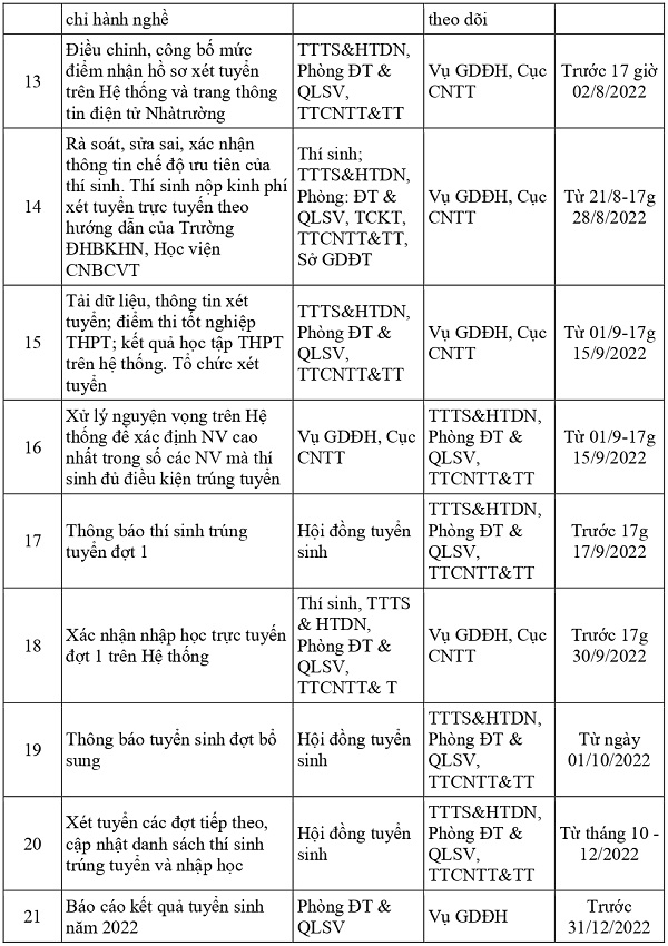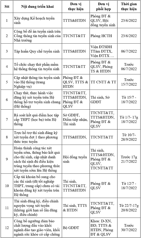 Để đảm bảo tiến độ Kế hoạch tuyển sinh năm 2022, Hội đồng tuyển sinh yêu cầu các đơn vị hoàn thành tốt nhiệm vụ được giao trực tiếp thực hiện hoặc phối hợp thực hiện trên đây. Trong quá trình thực hiện, nếu có vấn đề phát sinh, báo cáo Hội đồng tuyển sinh để có phương án giải quyết kịp thời./.