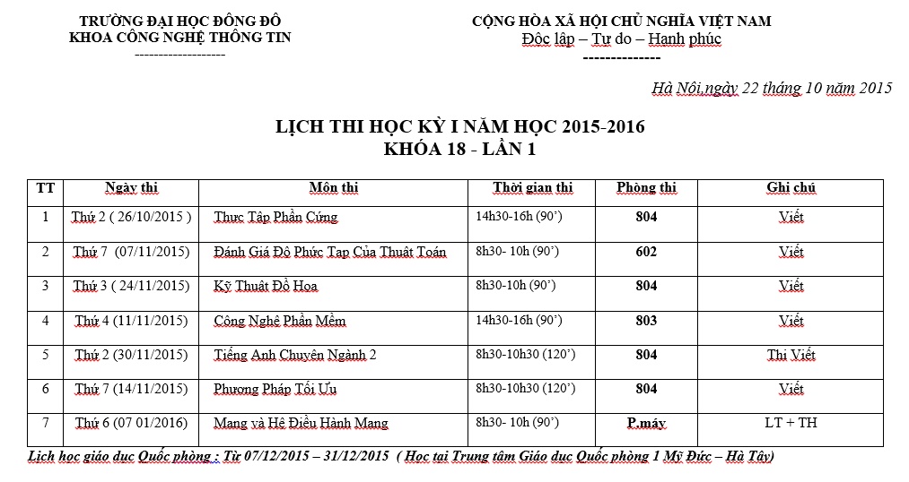 Lịch thi học kỳ I- khóa 18 năm học 2015- 2016