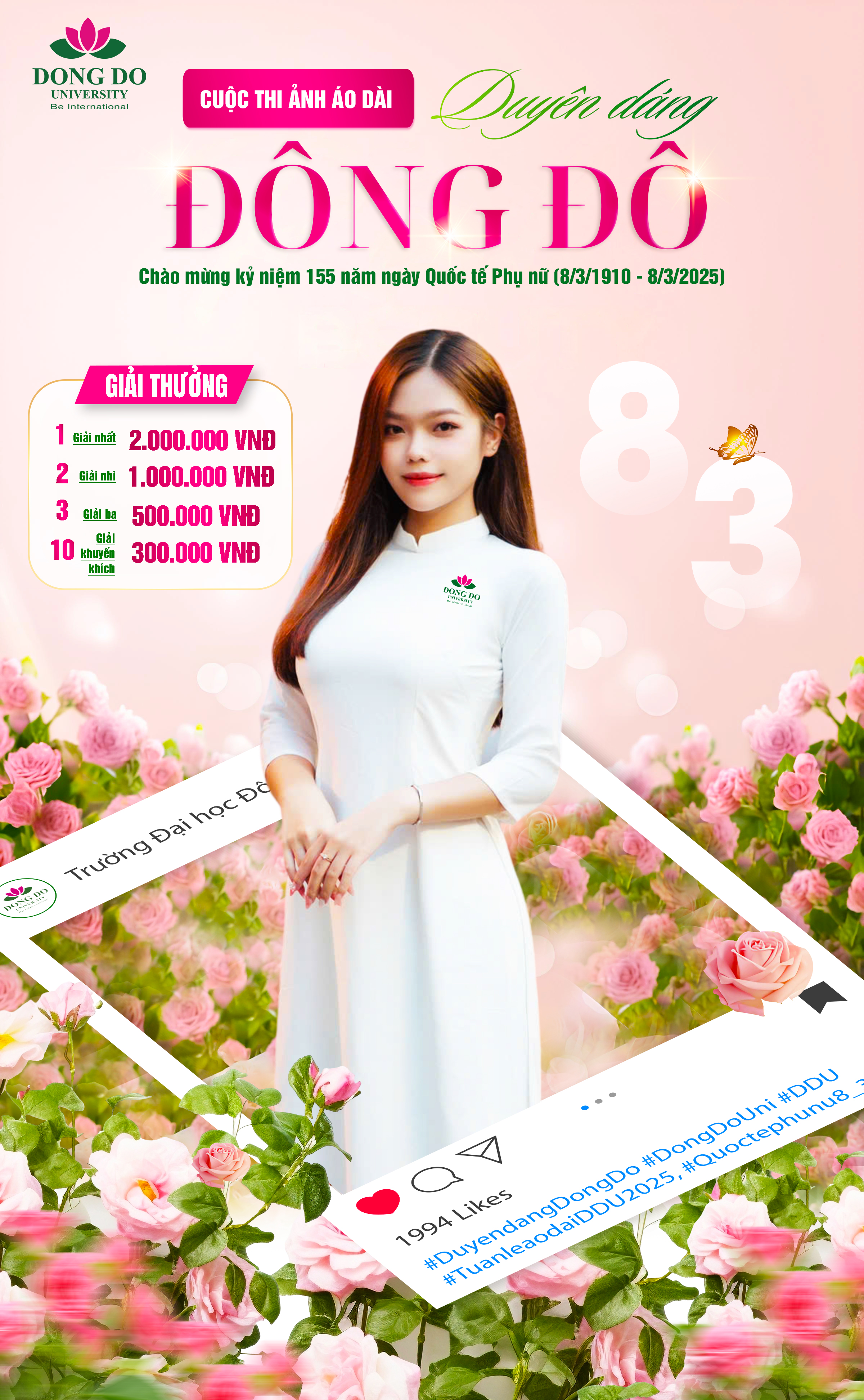 Hưởng ứng Tuần lễ Áo dài năm 2025 do TW Hội LHPN Việt Nam phát động và hướng tới kỷ niệm 155 năm ngày Quốc tế Phụ nữ (8/3/1910- 8/3/2025). Trường Đại học Đông Đô tổ chức cuộc thi ảnh “Duyên dáng Đông Đô”, nhằm tôn vinh vẻ đẹp Áo dài truyền thống và nét duyên dáng của phụ nữ Việt Nam nói chung và DDU nói riêng.