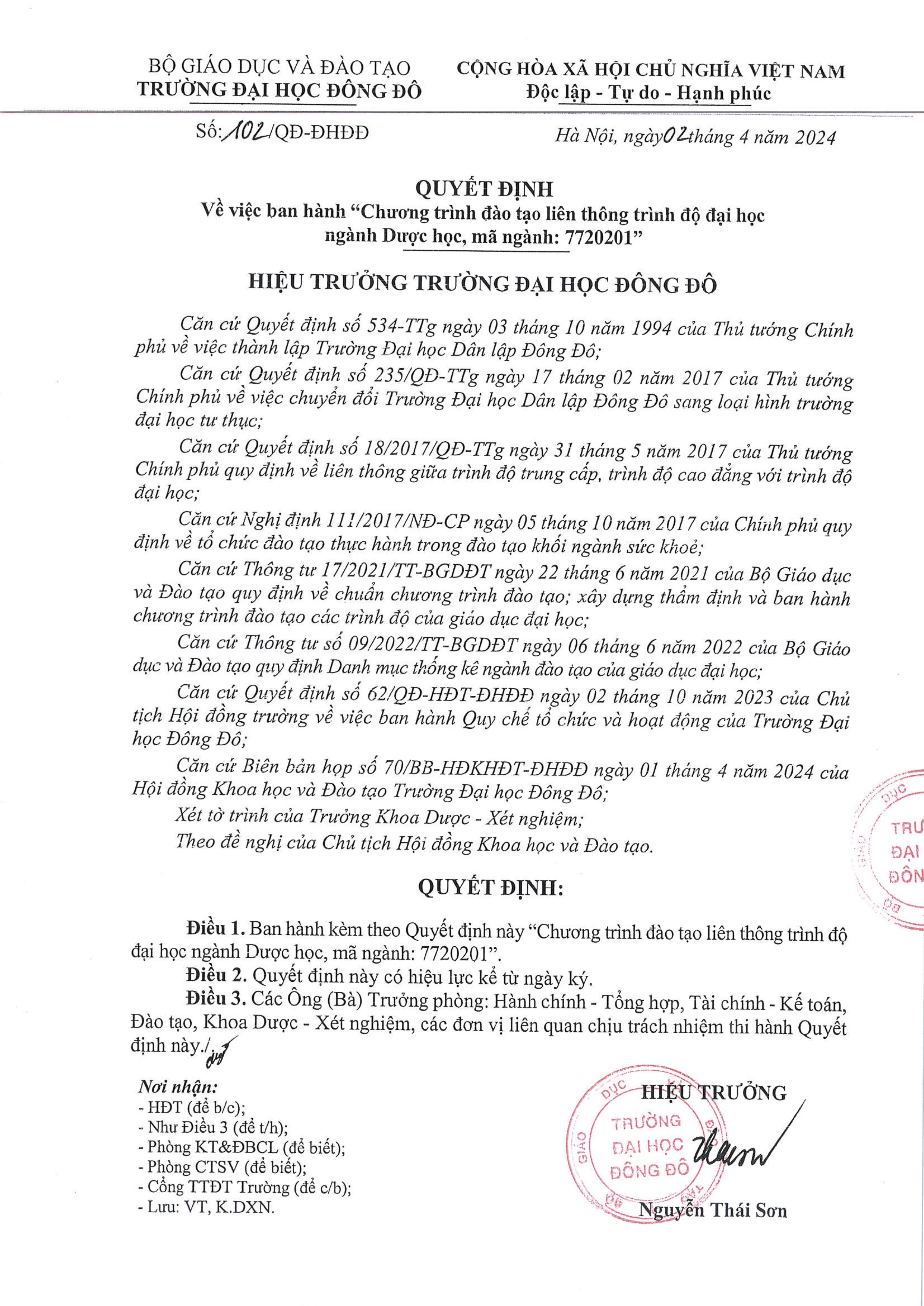 Quyết định số 102/QĐ-ĐHĐĐ của Hiệu trưởng Trường Đại học Đông Đô về việc ban hành "Chương trình đào tạo liên thông trình độ Đại học ngành Dược học, mã ngành: 7720201"