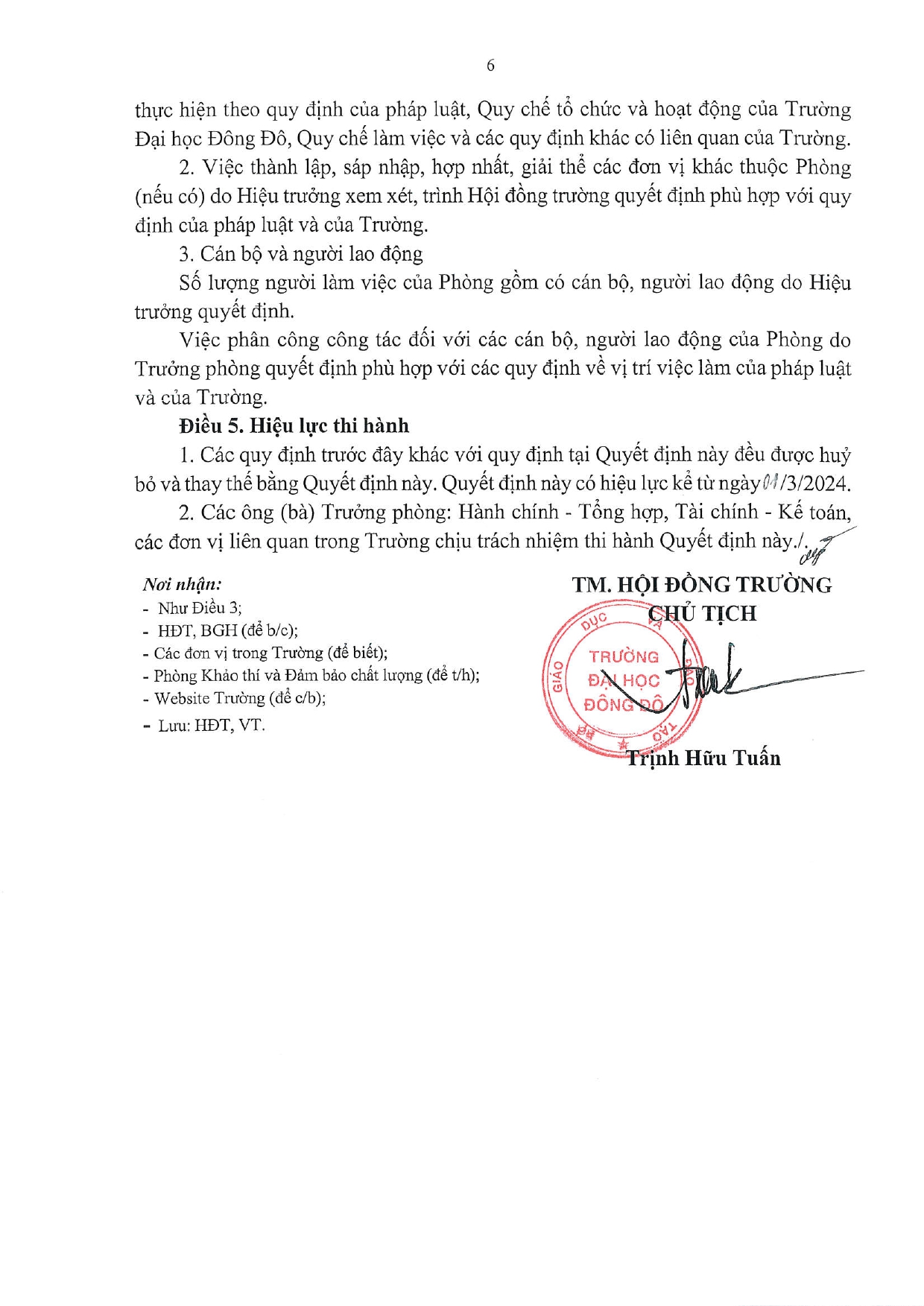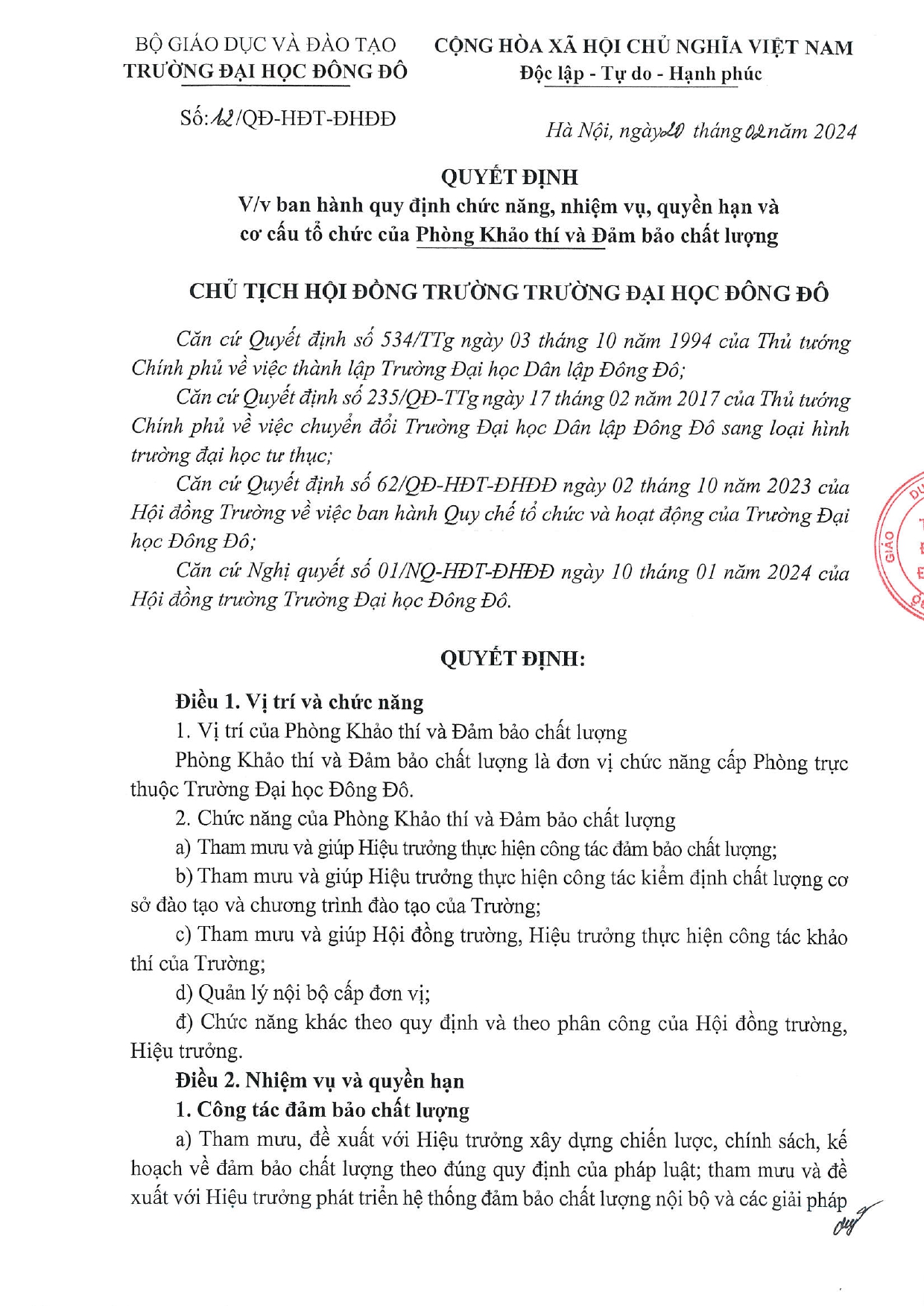 Chủ tịch hội đồng trường Đại học Đông Đô ra quyết định về việc ban hành quy định chức năng, nhiệm vụ, quyền hạn và cơ cấu tổ chức của phòng Khảo thí và Đảm bảo chất lượng. Chi tiết ở văn bản dưới đây: