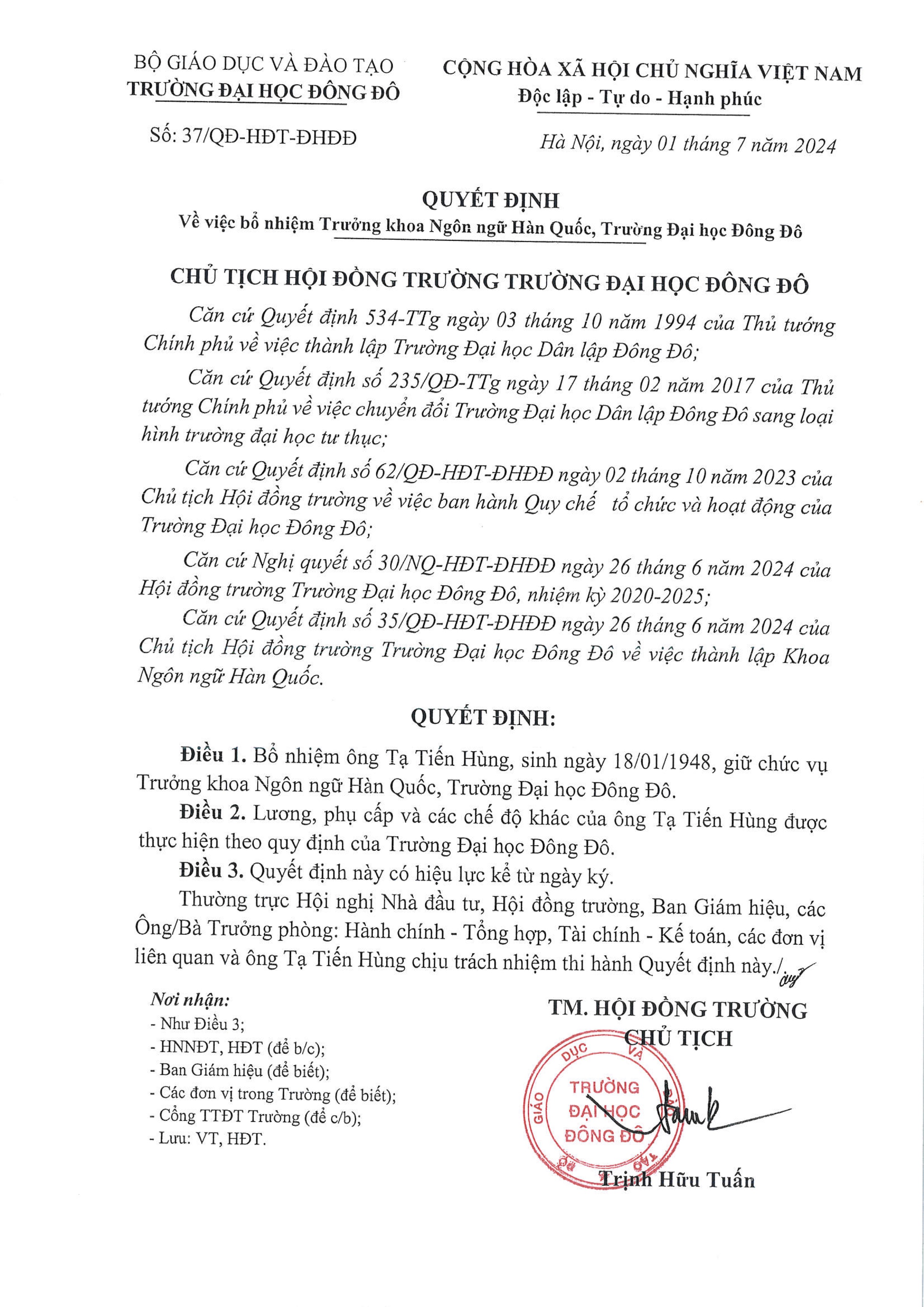 Quyết định bổ nhiệm Trưởng khoa Ngôn ngữ Hàn Quốc