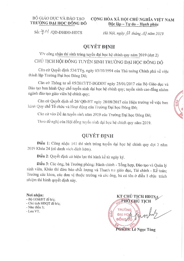 Quyết định công nhận thí sinh trúng tuyển đại học hệ chính quy năm 2019 - đợt 2