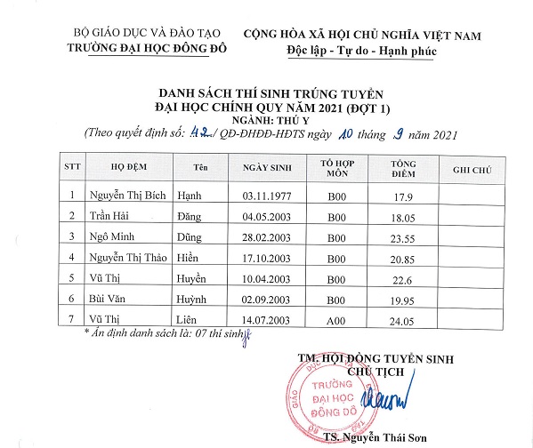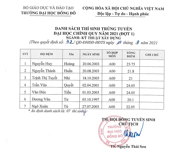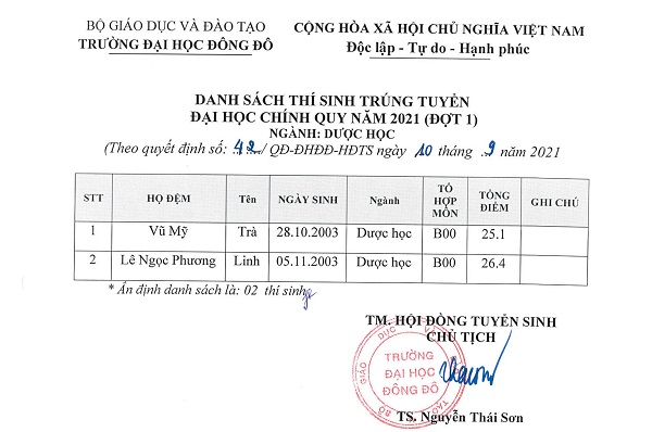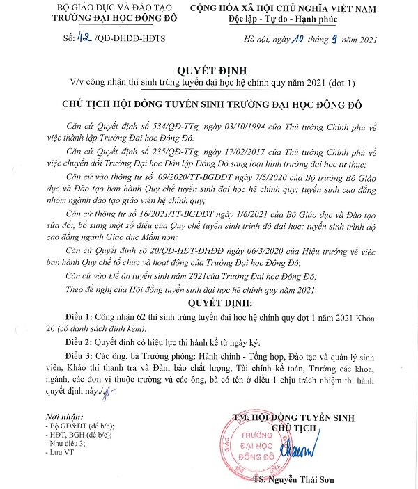Quyết định công nhận thí sinh trúng tuyển đại học hệ chính quy năm 2021 (đợt 1)