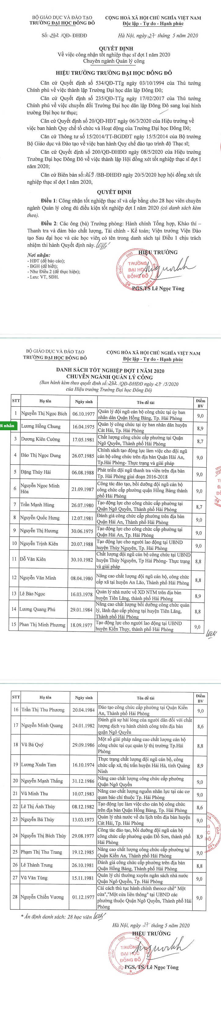 Quyết định về việc công nhận tốt nghiệp Thạc sĩ đợt 1 năm 2020 - chuyên ngành Quản lý công