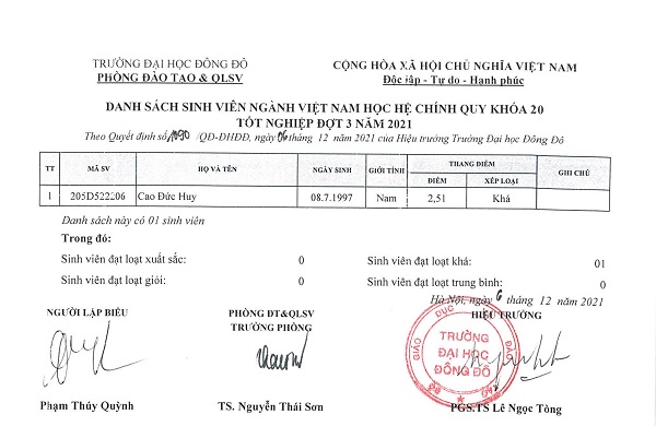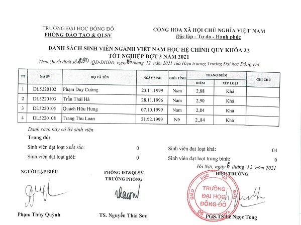 Quyết định về việc công nhận tốt nghiệp và cấp bằng tốt nghiệp đại học đợt 3 năm 2021