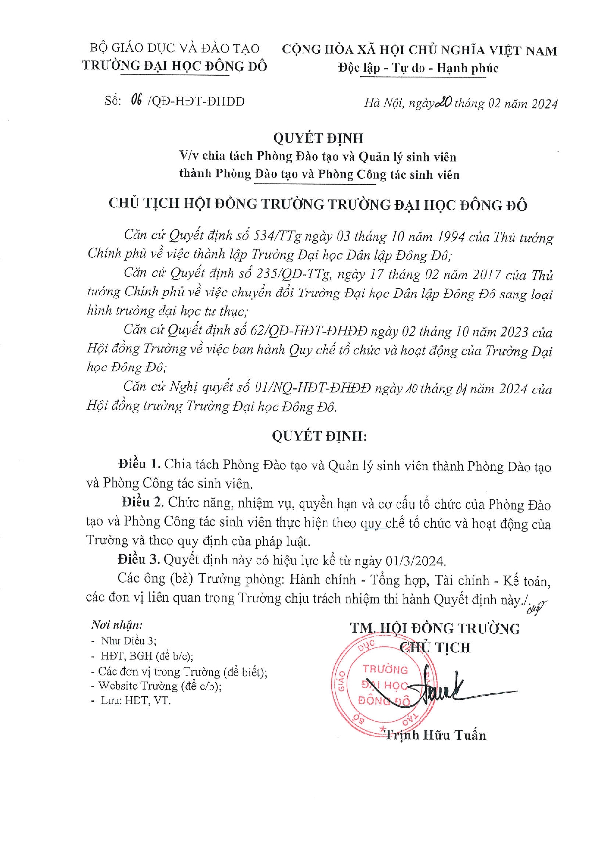Trường Đại học Đông Đô thông báo Quyết định số 06/QĐ - HĐT- ĐHĐĐ về việc tách phòng Đào tạo và Quản lý sinh viên thành phòng Đào tạo và phòng Quản lý sinh viên. Toàn văn quyết định đính kèm đưới đây.