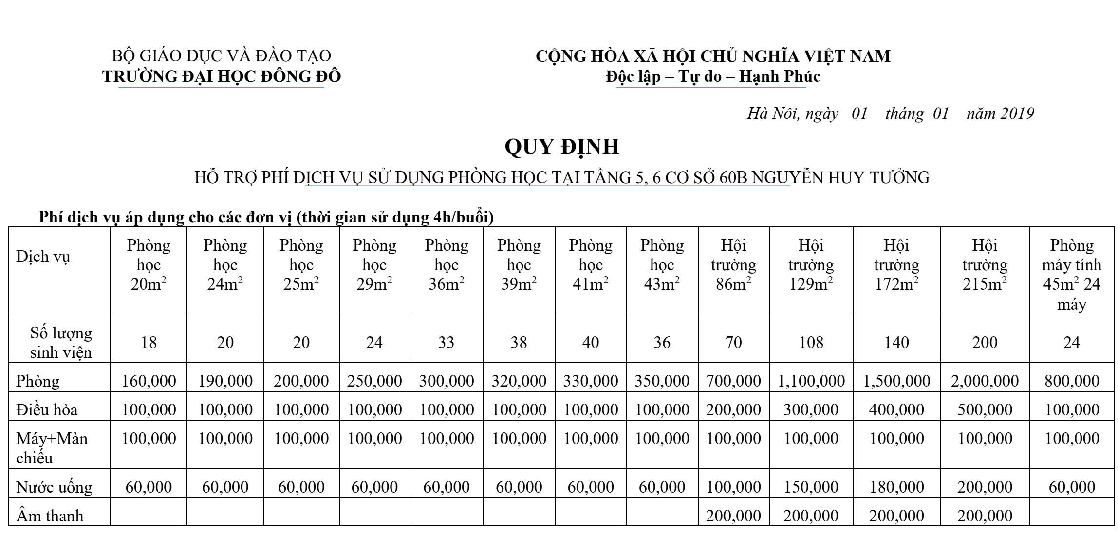 Thông báo: Hỗ trợ phí dịch vụ sử dụng phòng học tại tầng 5, 6 cơ sở 60B Nguyễn Huy Tưởng