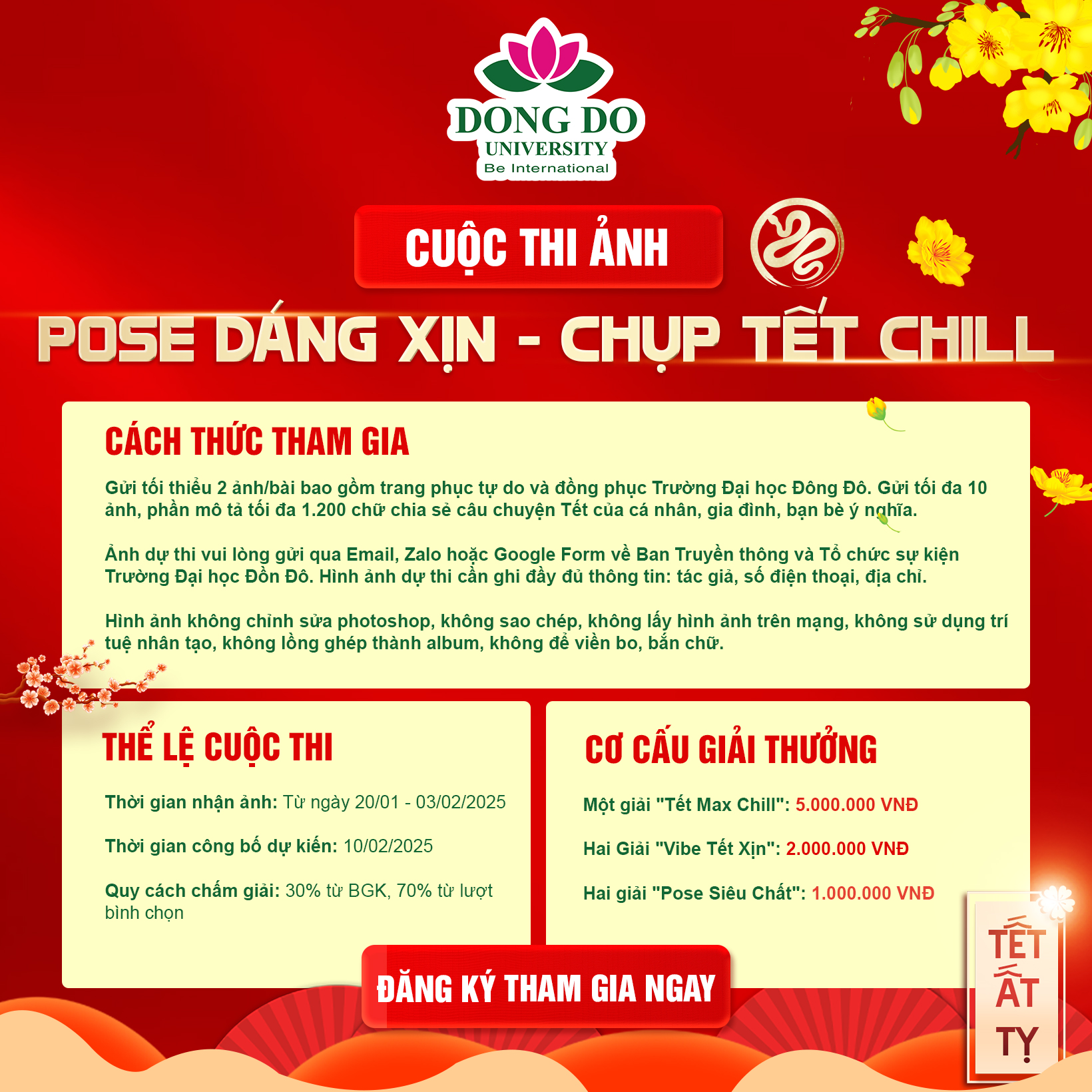 - Email: daihocdongdo@hdiu.edu.vn (Bài dự thi gửi qua email sẽ sử dụng tiêu đề: Dự thi Pose Dáng Xịn - Chụp Tết Chill _Họ tên_Đơn vị công tác/học tập_Thông tin liên hệ)