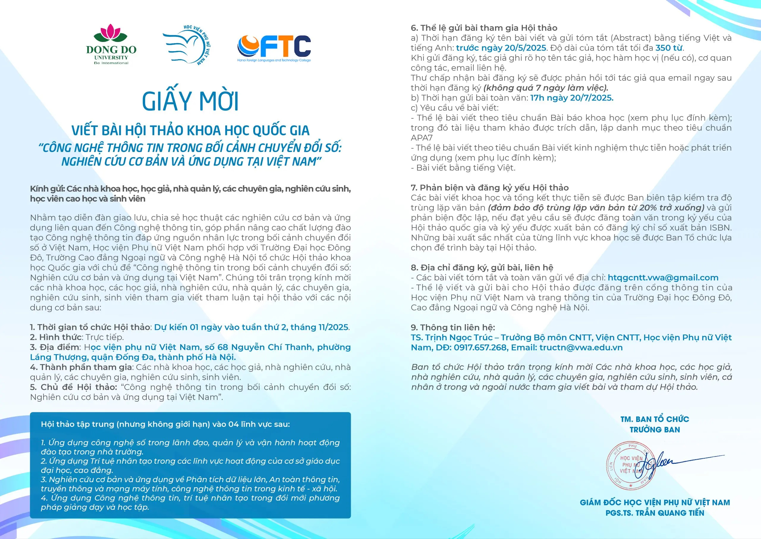 Dự kiến tháng 11/2025, Trường Đại học đông Đô phối hợp cùng Học viện Phụ nữ Việt Nam sẽ tổ chức Hội thảo khoa học Quốc gia “Công nghệ thông tin trong bối cảnh chuyển đổi số: Nghiên cứu cơ bản và ứng dụng tại Việt Nam”. Nhà Trường trân trọng gửi thư mời viết bài tham gia hội thảo tới Các nhà khoa học, học giả, nhà quản lý, các chuyên gia, nghiên cứu sinh, học viên cao học và sinh viên.