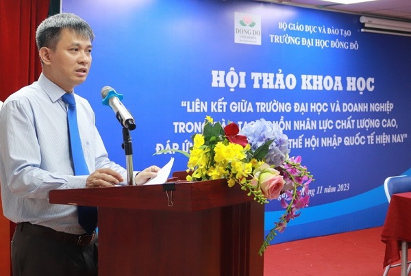 TS. Đoàn Anh Tuấn - Bí thư Đảng uỷ, Phó Hiệu trưởng Nhà trường phát biểu tại Hội thảo Theo Phó Hiệu trưởng Trường ĐH Đông Đô, việc liên kết với doanh nghiệp cũng nhằm nâng cao chất lượng, hiệu quả đào tạo của các cơ sở giáo dục đại học. Đồng thời, thúc đẩy quá trình đổi mới, sáng tạo và chuyển giao công nghệ, gắn kết các hoạt động nghiên cứu cùng với hoạt động sản xuất, kinh doanh tại các doanh nghiệp.